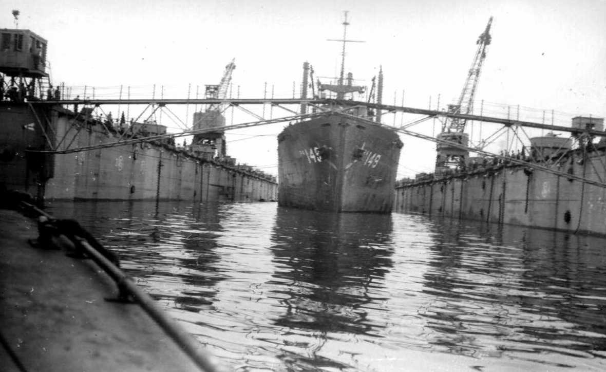 112k | USS Audubon (APA-149) in floating dry dock USS ABSD-5, at Guiuan, Samar, August 1945. Photo courtesy of the USS Audubon crew files. | Robert Hurst | |