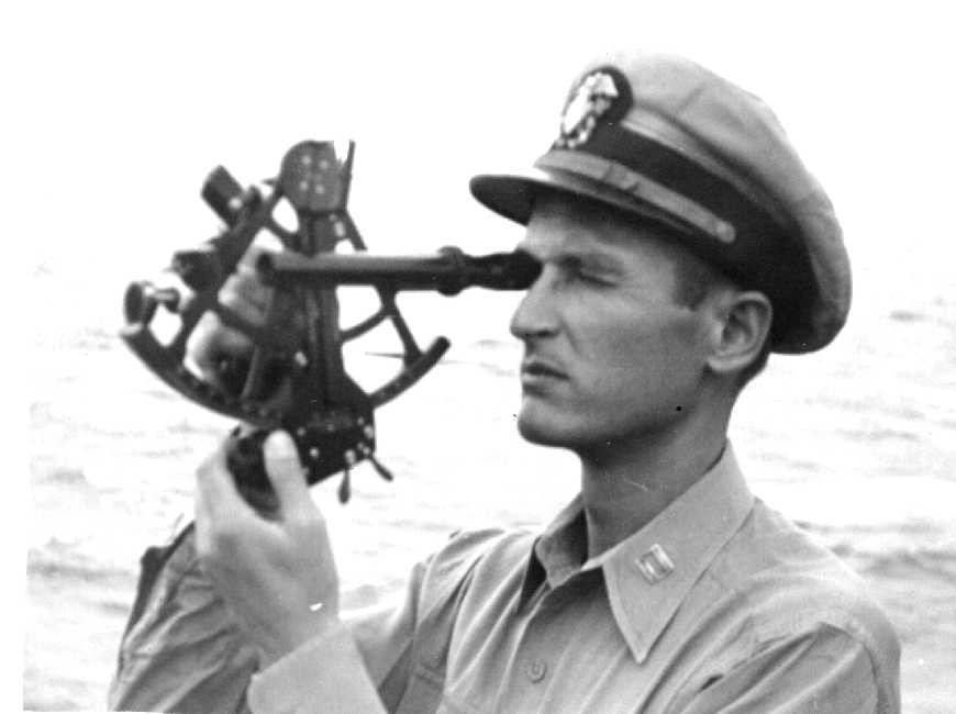 45k | USS Audubon (APA-149) navigator, LT. Lakusta, on the bridge using a sextant. Photo courtesy of the USS Audubon crew files. | Robert Hurst | |