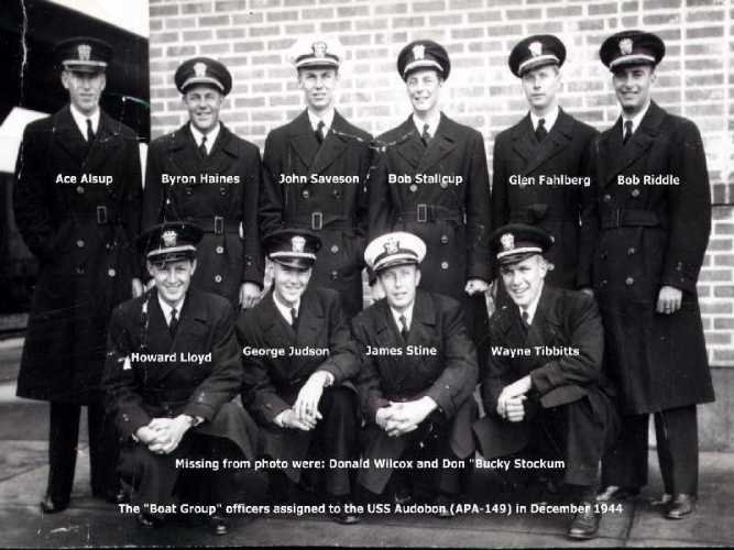 62k | USS Audubon (APA-149) Boat Group Officers, December 1944. Photo courtesy of the USS Audubon crew files. |