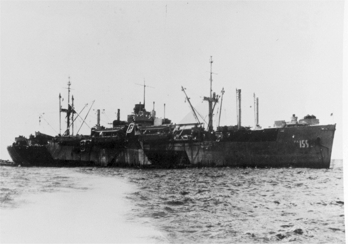USS Lycoming (APA-155) at anchor, circa 1945.