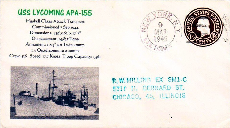 USS Lycoming (APA-155) postcard, circa 1945. |