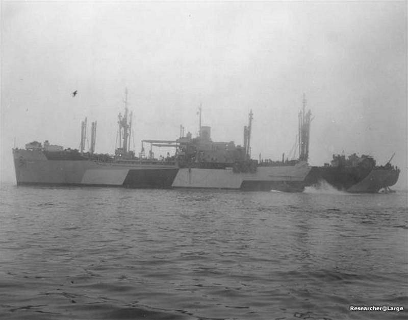 Deuel's bow. USS Wyandot (AKA-92) is in the background. US Navy photo # 80-G-434031, now in the collections of the U.S. National Archives |