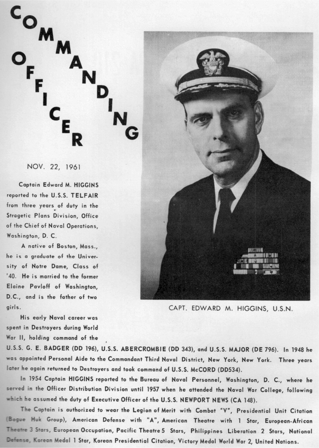 | 11 | CAPT. Higgins Jr., Edward Matthew, USN (USNA 1940) | 22 November 1961 - 20 December 1962 |
