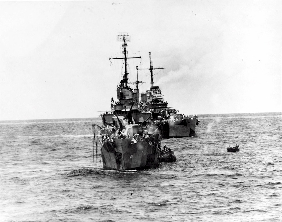 survivors as USS Honolulu (CL-48) stands by in the background, in the morning on 12