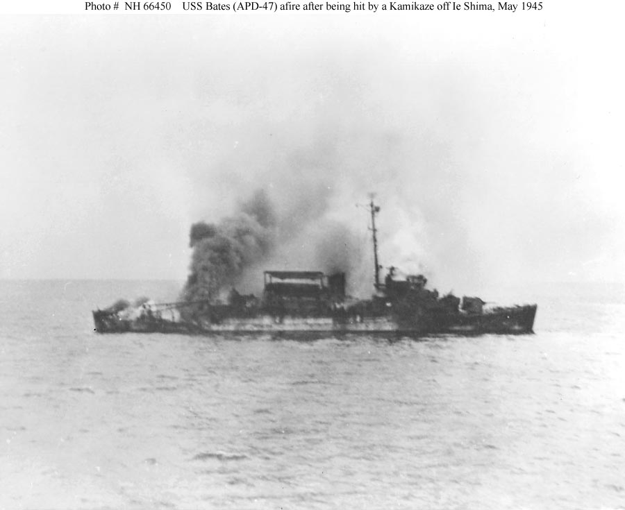 USS Bates (APD-47) burning off Ie Shima, Ryukyu Islands, after a suicide attack by three Japanese planes, 25 May 1945. Photo from the collection of Admiral Harry W. Hill, USN. US Naval History and Heritage Command photo #NH 66450. |