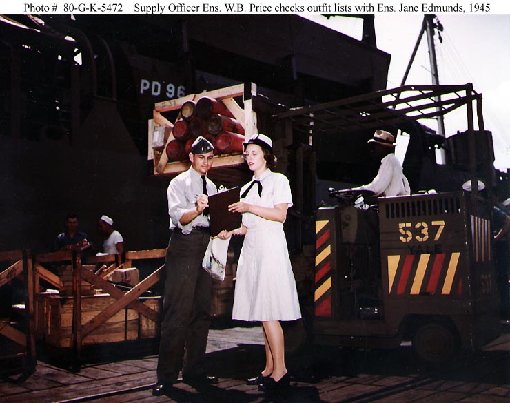 83k | USS Ray K. Edwards (APD-96) soon after commissioning on 11 June 1945, takes on stores at Charleston Navy Yard, S.C, prior to her shakedown cruise. Her Supply Officer, ENS. W.B. Price, checks outfit lists with ENS. Jane Edmunds, of the Navy Yard Ships' Outfitting Office, as a forklift truck brings up a pallet of pressurized gas bottles. US National Archives photo #80-G-K-5472 (Color), a US Navy photo now in the collections of the US National Archives. |