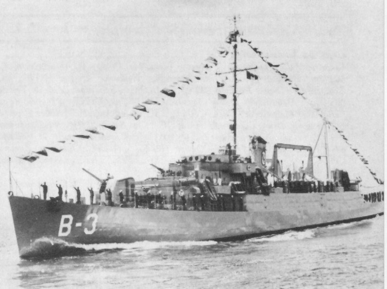 91k | Ex-USS Belet (APD-109) in the service of Mexico as ARM California (B-3) followed by ARM Papaloapan (B-4), [ex-USS Earhart (APD-113)] underway in 1969, location unknown. Image taken from the gunboat ARM Guanajuato (C-7). Official Mexican Navy photo. |