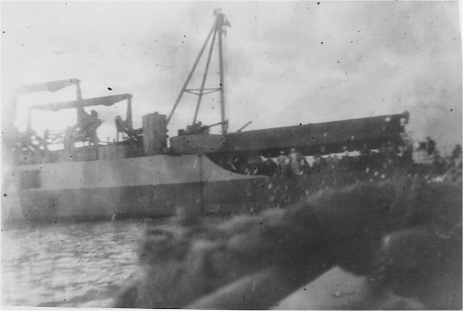 65k | USS Kline (APD-120) at anchor showing port side damage resulting from the anchor of USS LST-1002. catching the side of USS Kline while she was maneuvering through the nets at Saipan, 20 April 1945 | Scott Hendrick for his father James H. Hendrick PHM2/c USS Kline and Mary Wickre, Rod and Pat Day for their father Bill Day SC3/c USS Kline | |