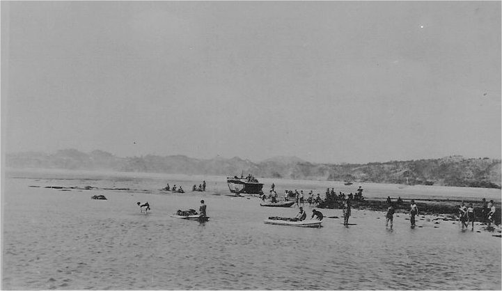 42k | USS Kline (APD-120) crew members on the beach at Okinawa, 2 April 1945. Official US Navy photo. |