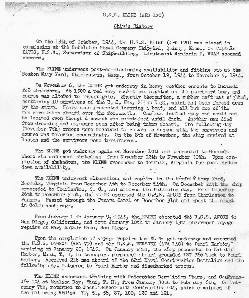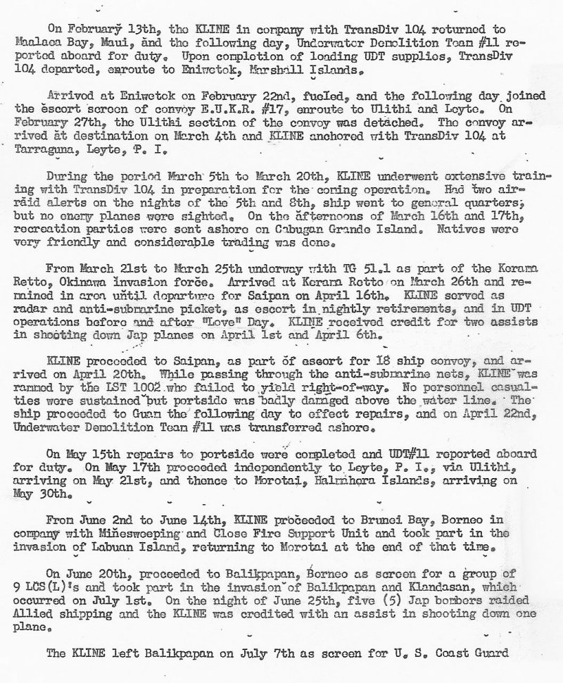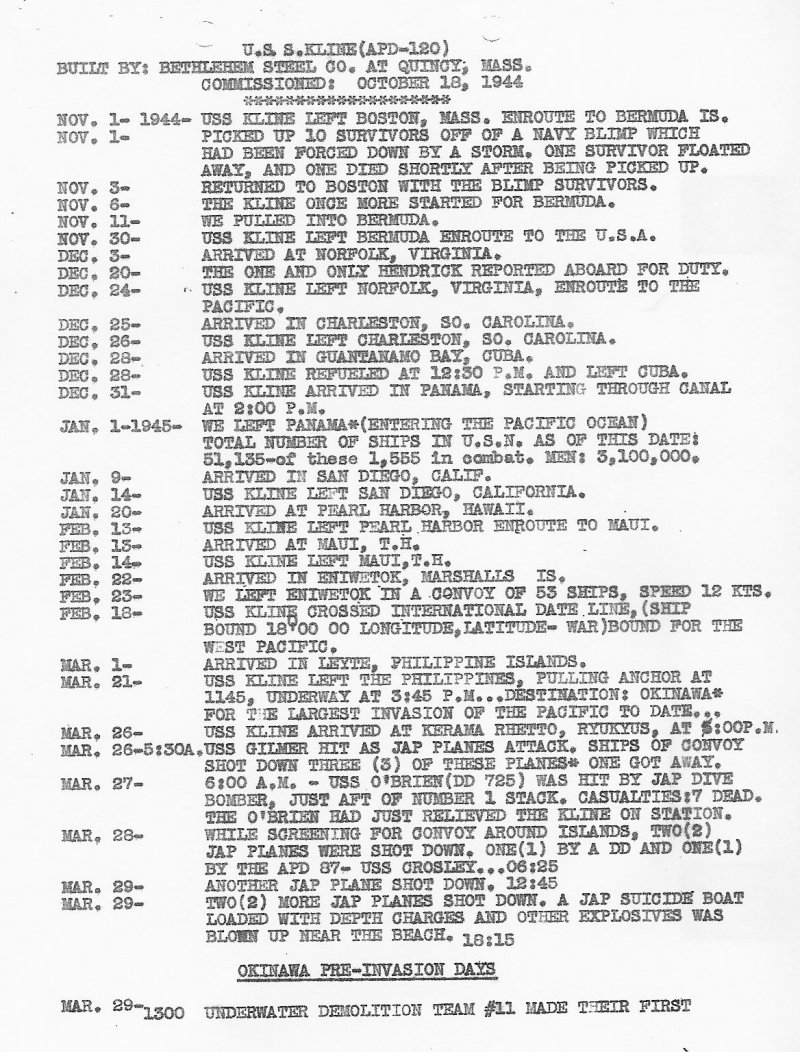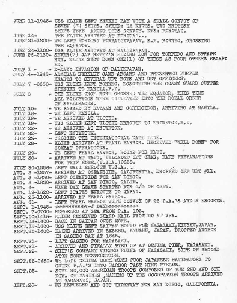 USS Kline Smooth Log 1944-45
