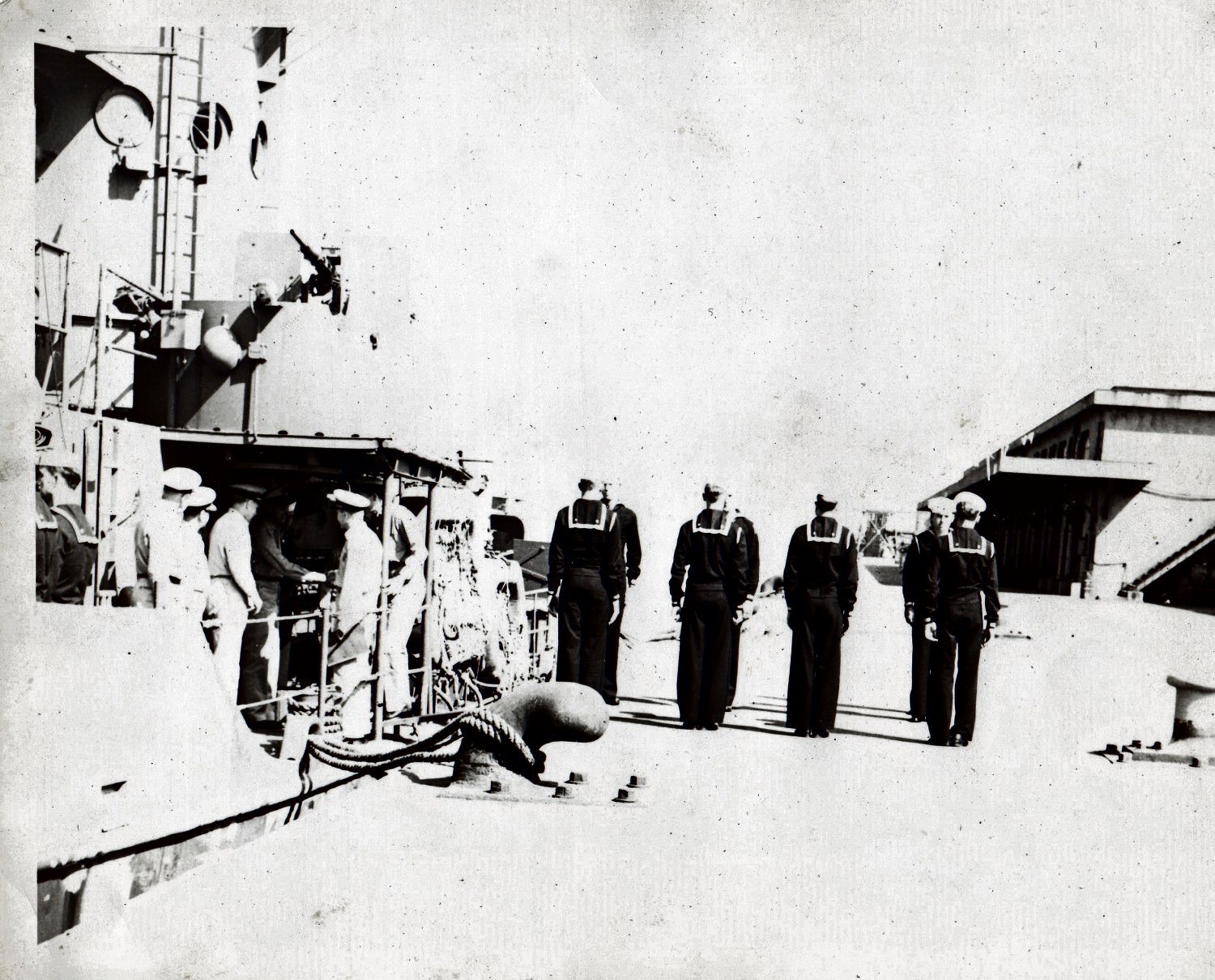 372k | USS LCS(L)(3)-21 moored pierside either in Japan after the surrender or in a US west coast port. Eight sideboys indicate that an important visitor (Vice Admiral or higher) was arriving possibly to present the Naval Unit Commendation for the ships 4 May 1945 action on Picket Station 13 north of Okinawa. | Jim Petro for his grandfather Michael Simko USS LCS(L)(3)-21 | |