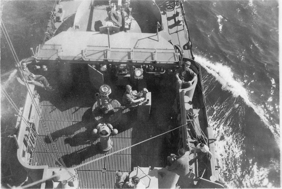 143k | View of the open bridge from the top of the mainmast of USS LCS(L)(3)-21 underway, date and location unknown | Jim Petro for his grandfather Michael Simko USS LCS(L)(3)-21 | |