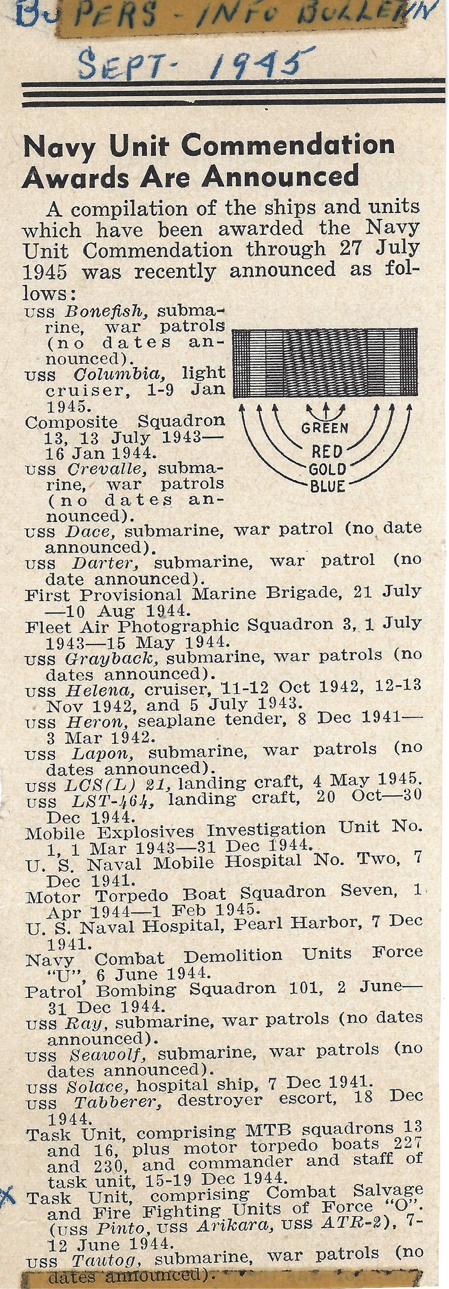 | 01 | LTjg. Geib, J. C., USNR | 14 October 1944 - ? |