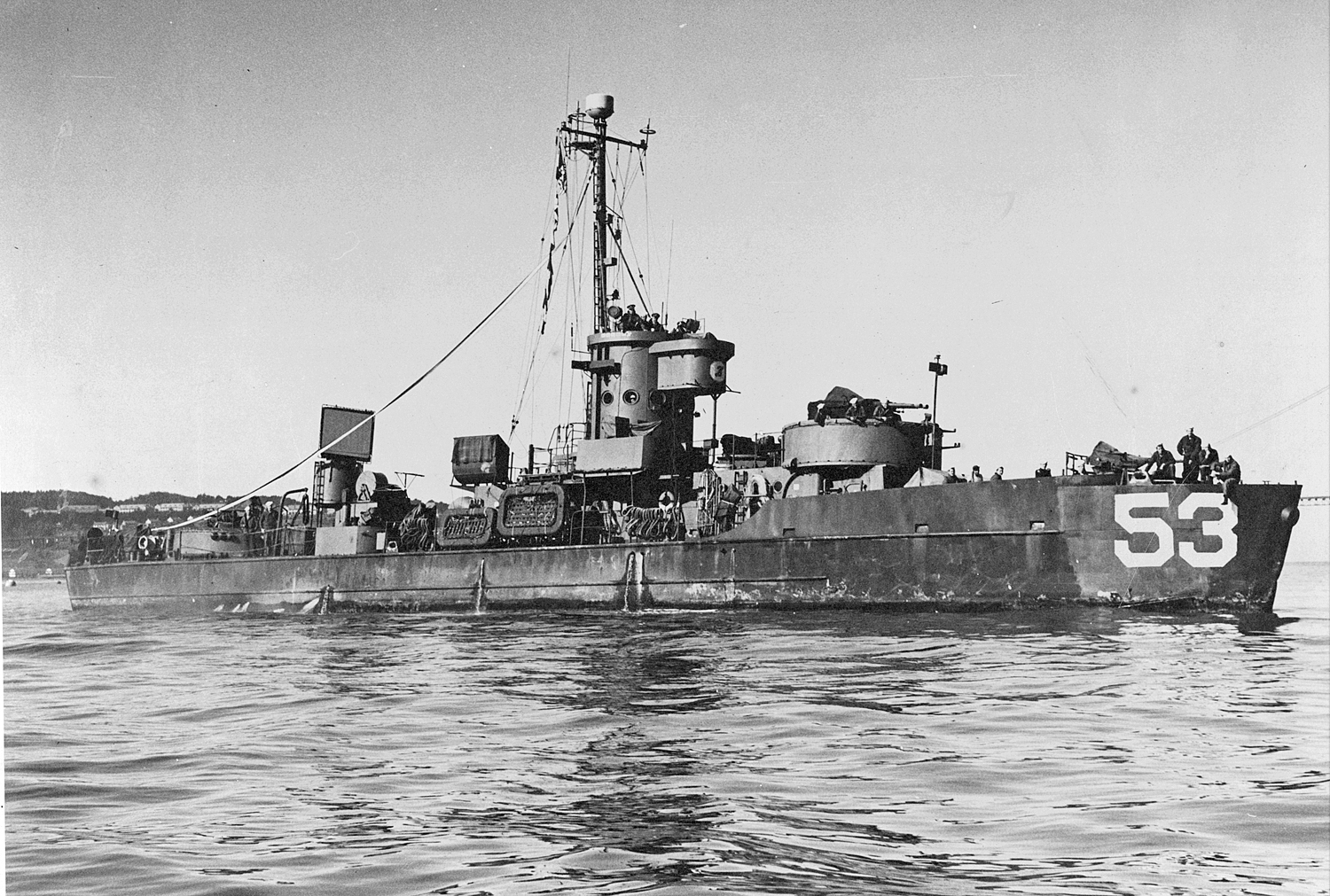 984k | USS LCS(L)(3)-53 under way in San Francisco Bay while returning home in 1946. ENS J. W. Middendorf USNR (later to be Secretary of the Navy, 1974-76) is the tall man on the bridge. Photo: from Middendorf's personal files. |