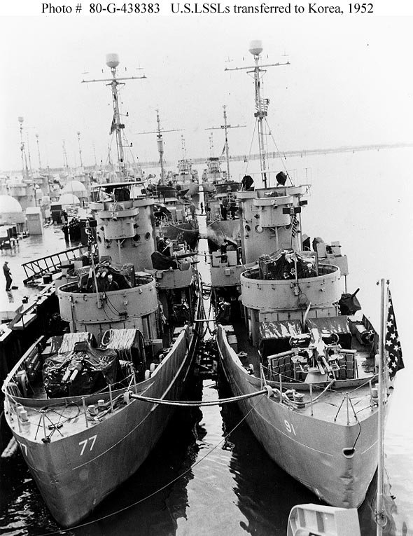 to the ROK Navy. In the foreground are USS LSSL-77, which became the Korean ROKS Yung Huang Man (LSSL-107), and USS LSSL-91 which became the Korean ROKS Kang Hwa Man (LSSL-108). Behind them are PC-485, which became the Korean ROKS Han La San (PC-705), and USS PC-600, which became the Korean ROKS Myo Hyang San (PC-706). Photograph is dated 24 January 1952. US Navy photo # 80-G-438383, now in the collections of the US National Archives |