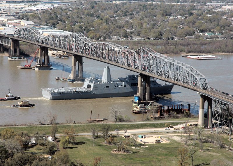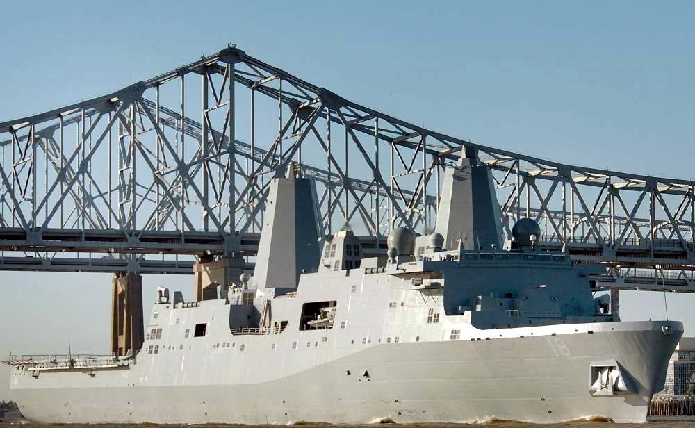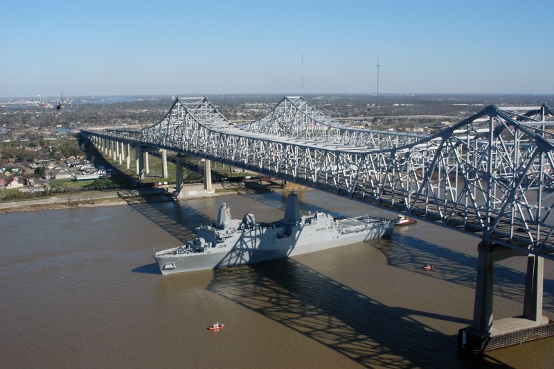 143k | New Orleans (LPD-18) leaves Avondale Shipyard. 5 March 2007, and transits underneath the Huey P. Long Bridge, on the Mississippi River toward her commissioning site in New Orleans. US Navy photo # 070305-N-7427G-002 by MC1 Shawn Graham. |
