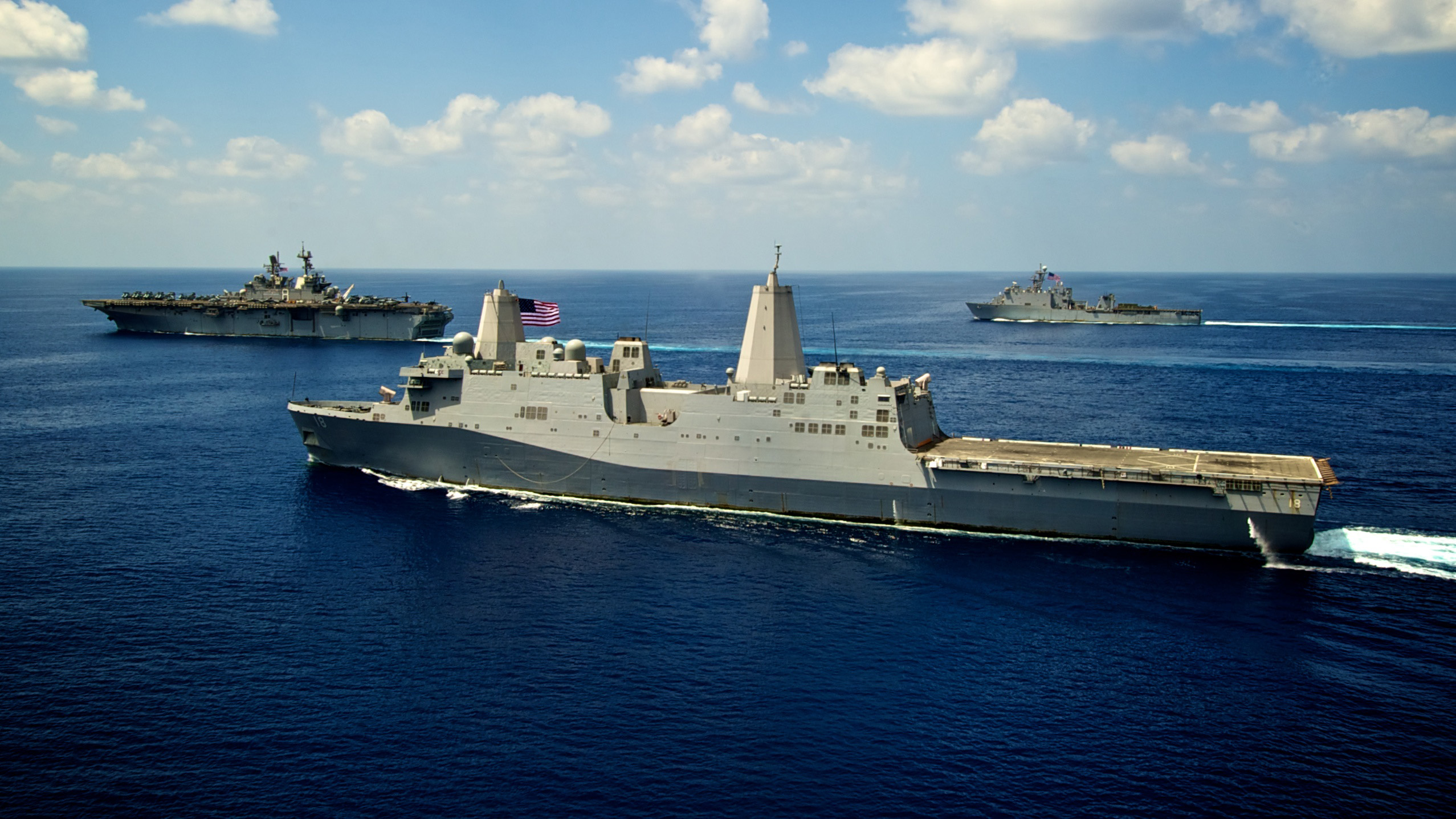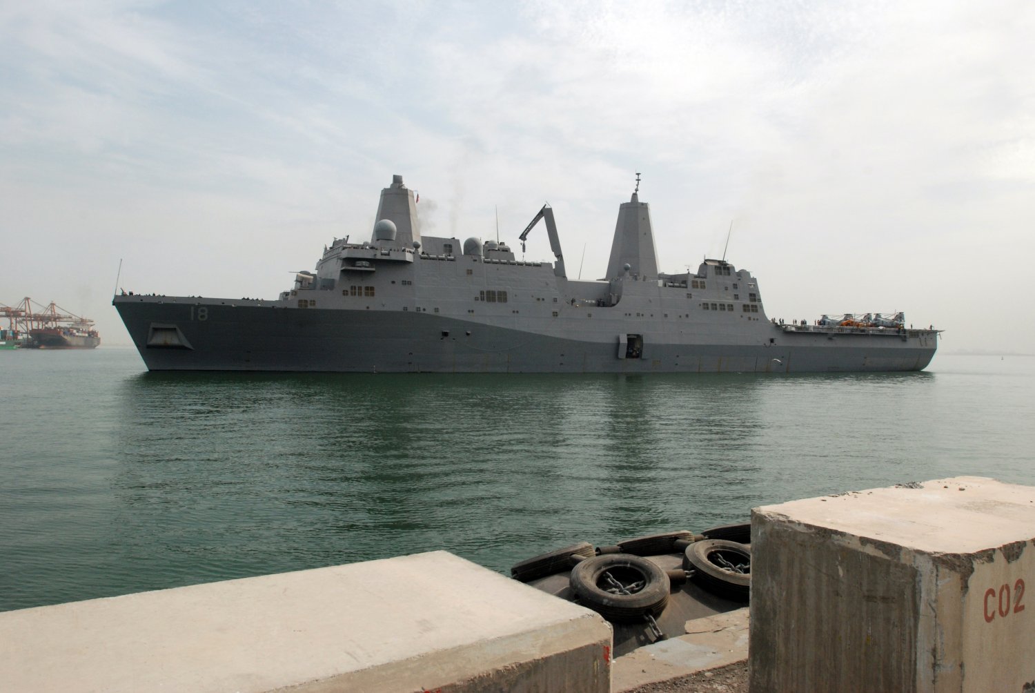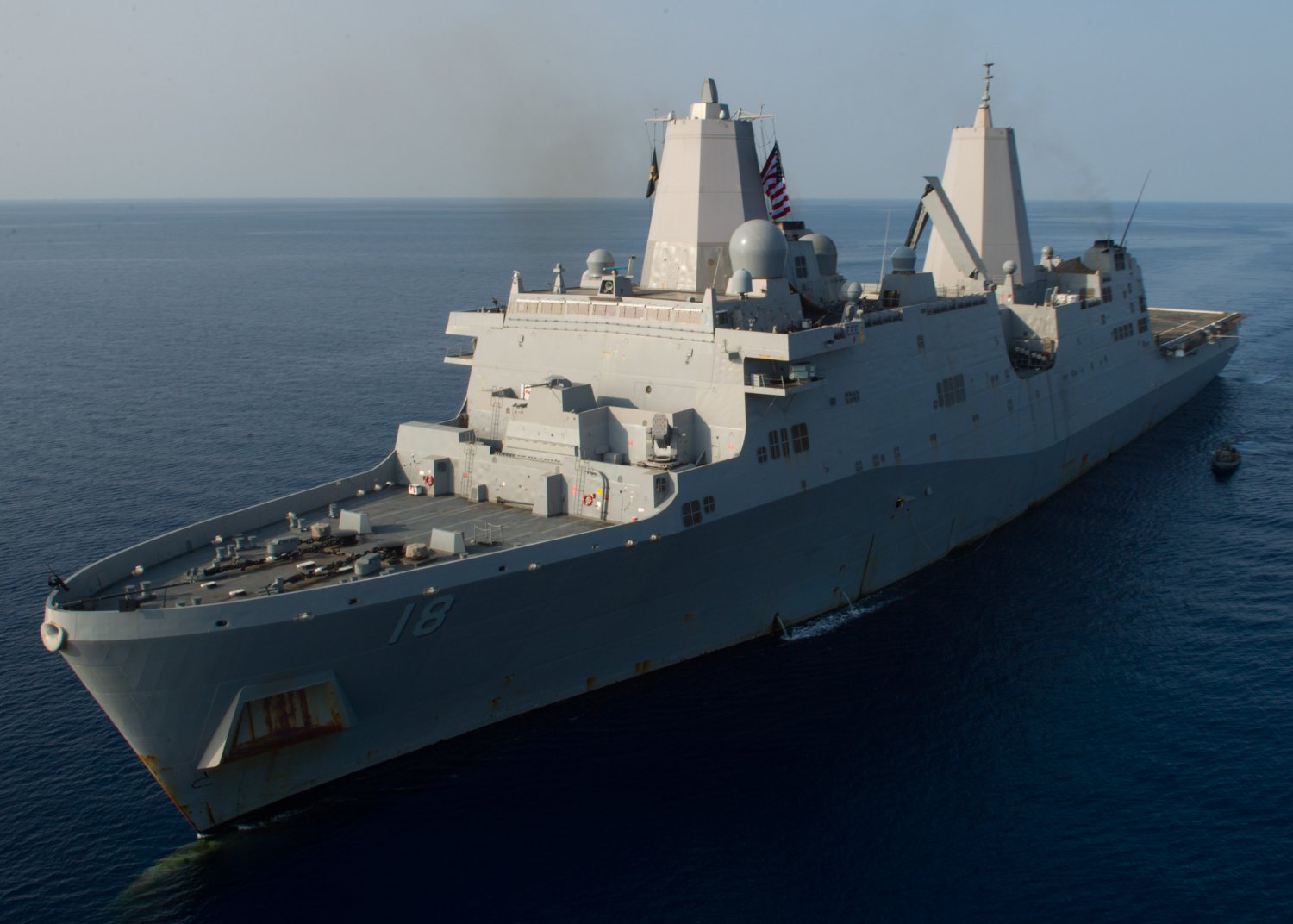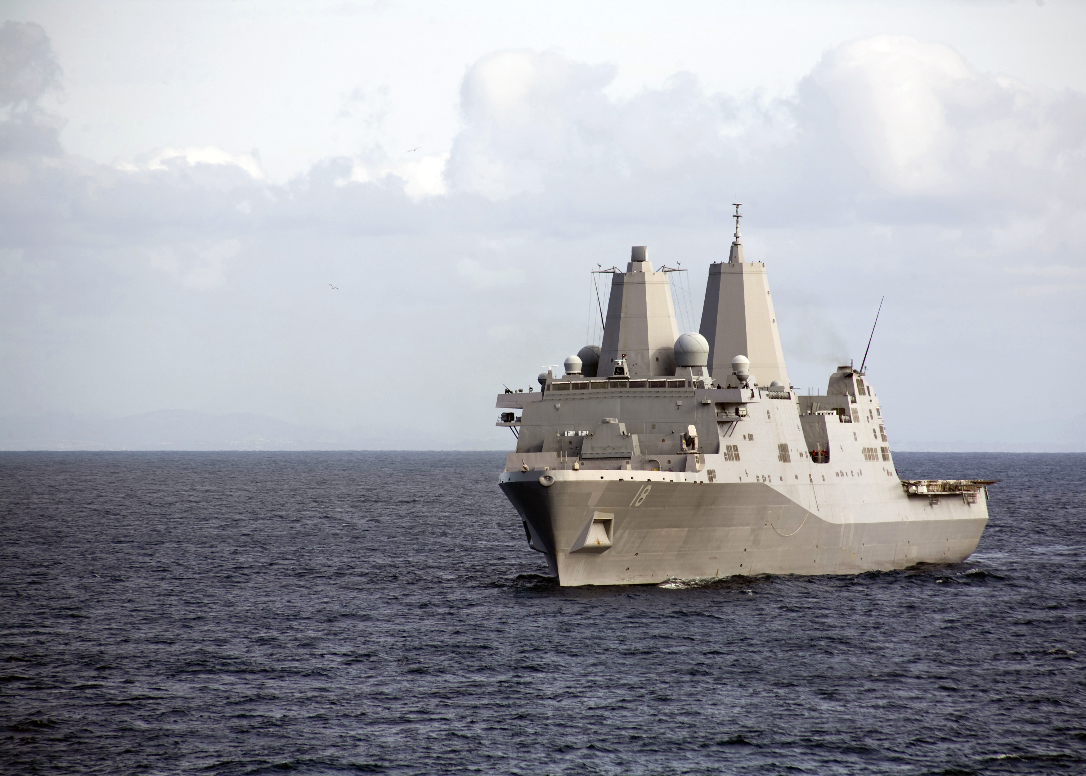 with the amphibious transport dock USS New Orleans (LPD-18), left, and the amphibious dock landing ship