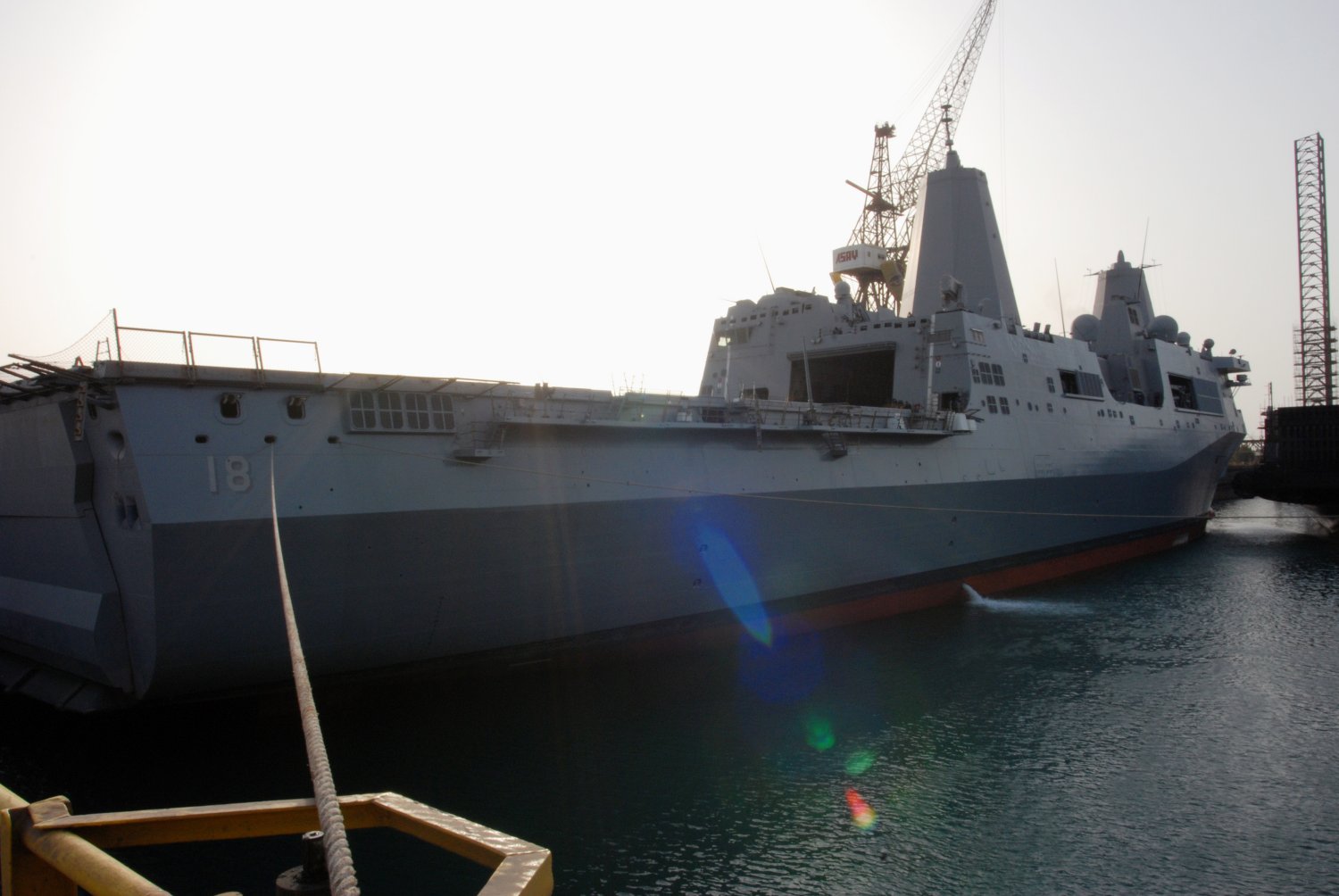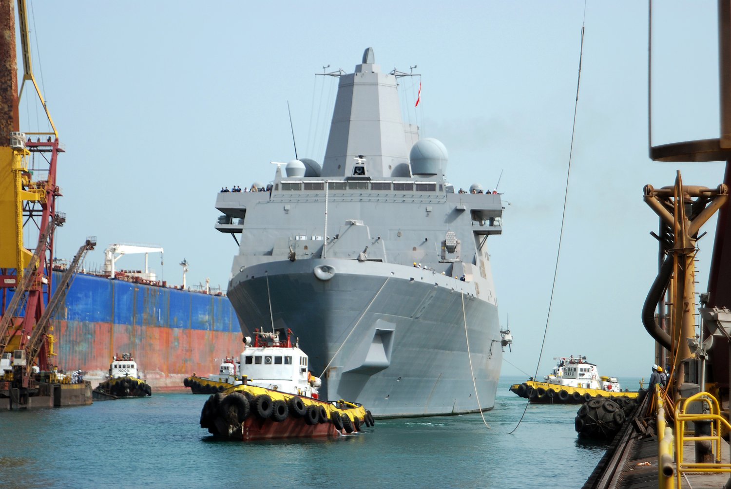 215k | USS New Orleans (LPD 18) is guided into the Arab Shipbuilding & Repair Yard Company dry-dock facility in Bahrain to perform