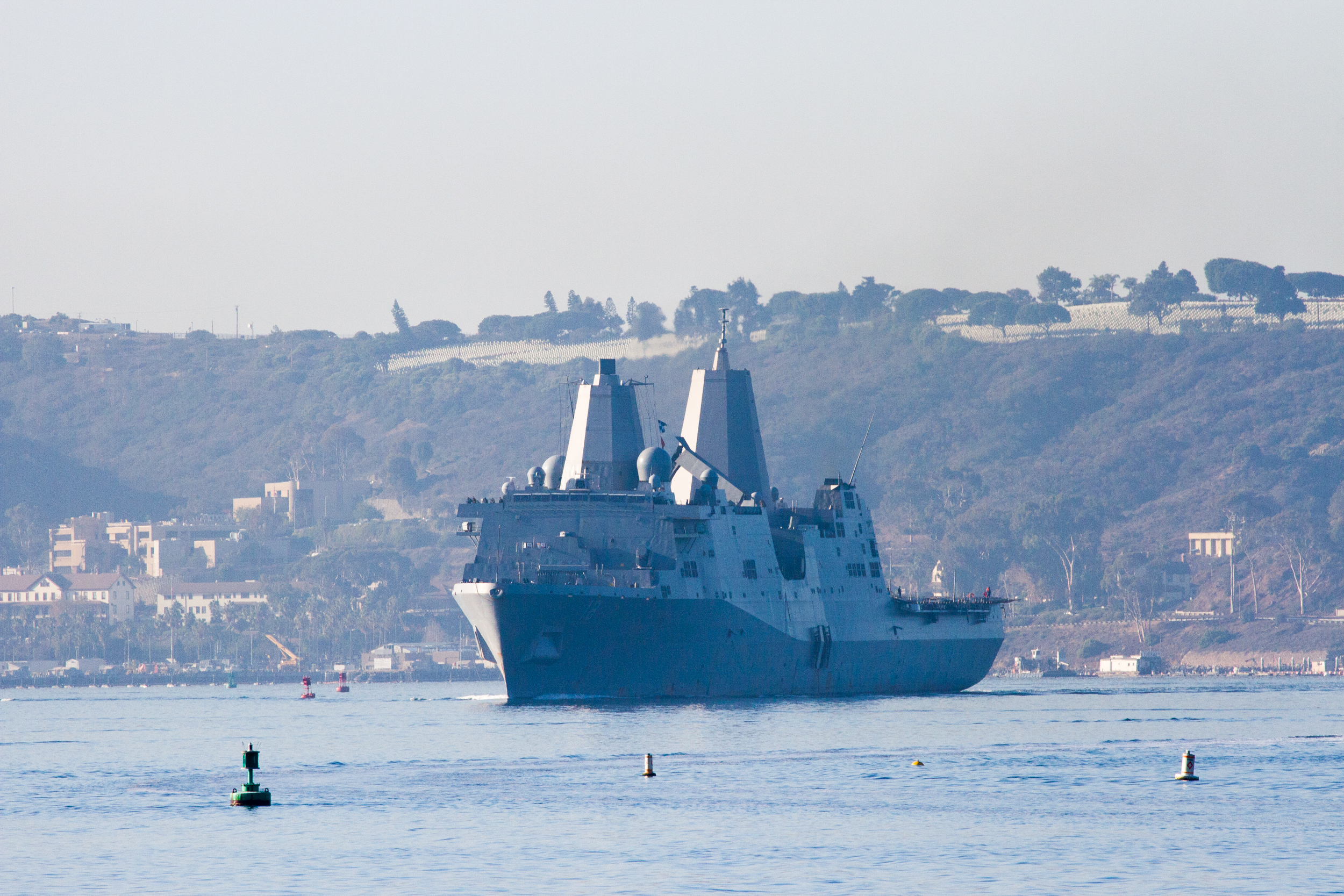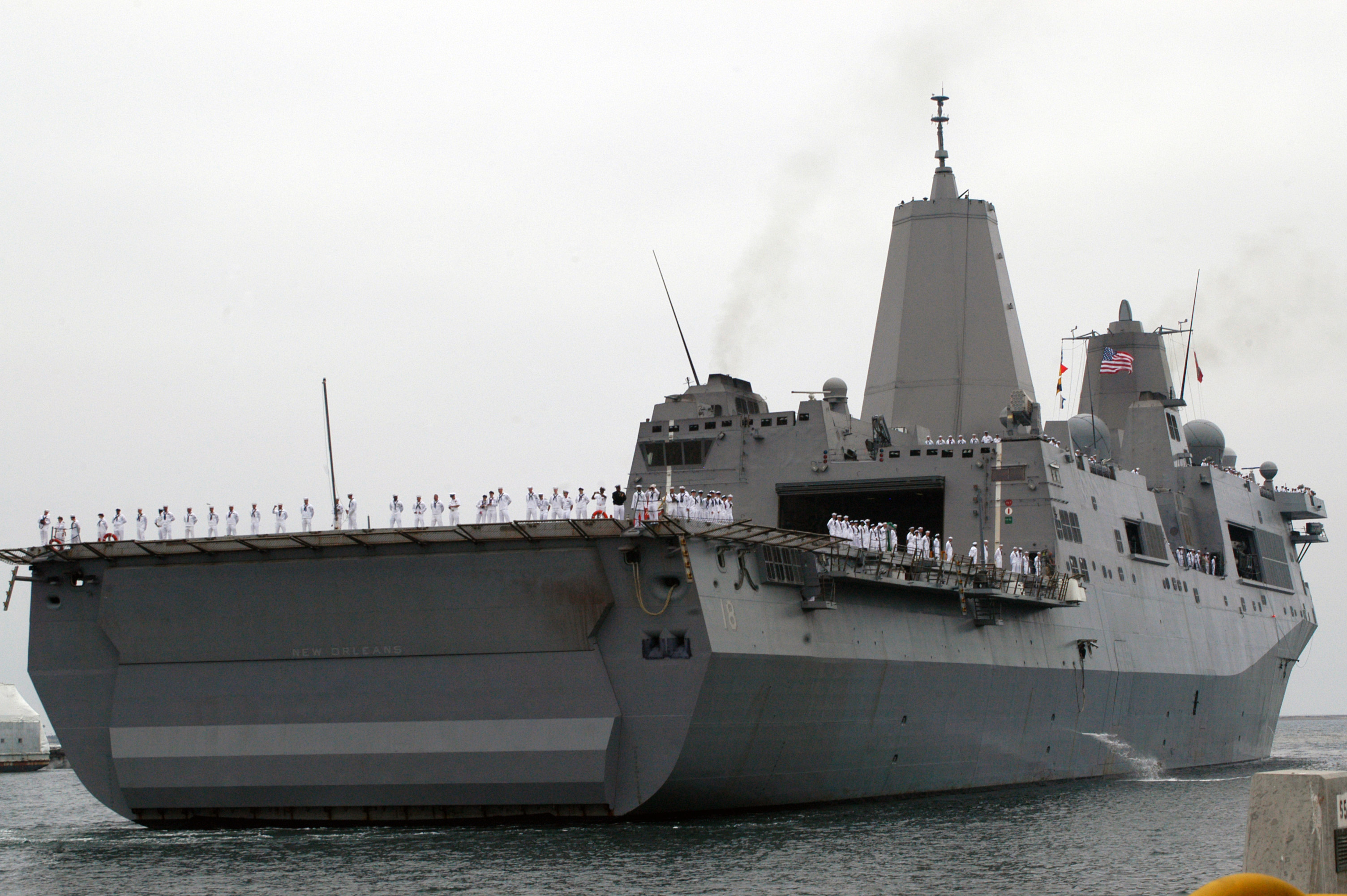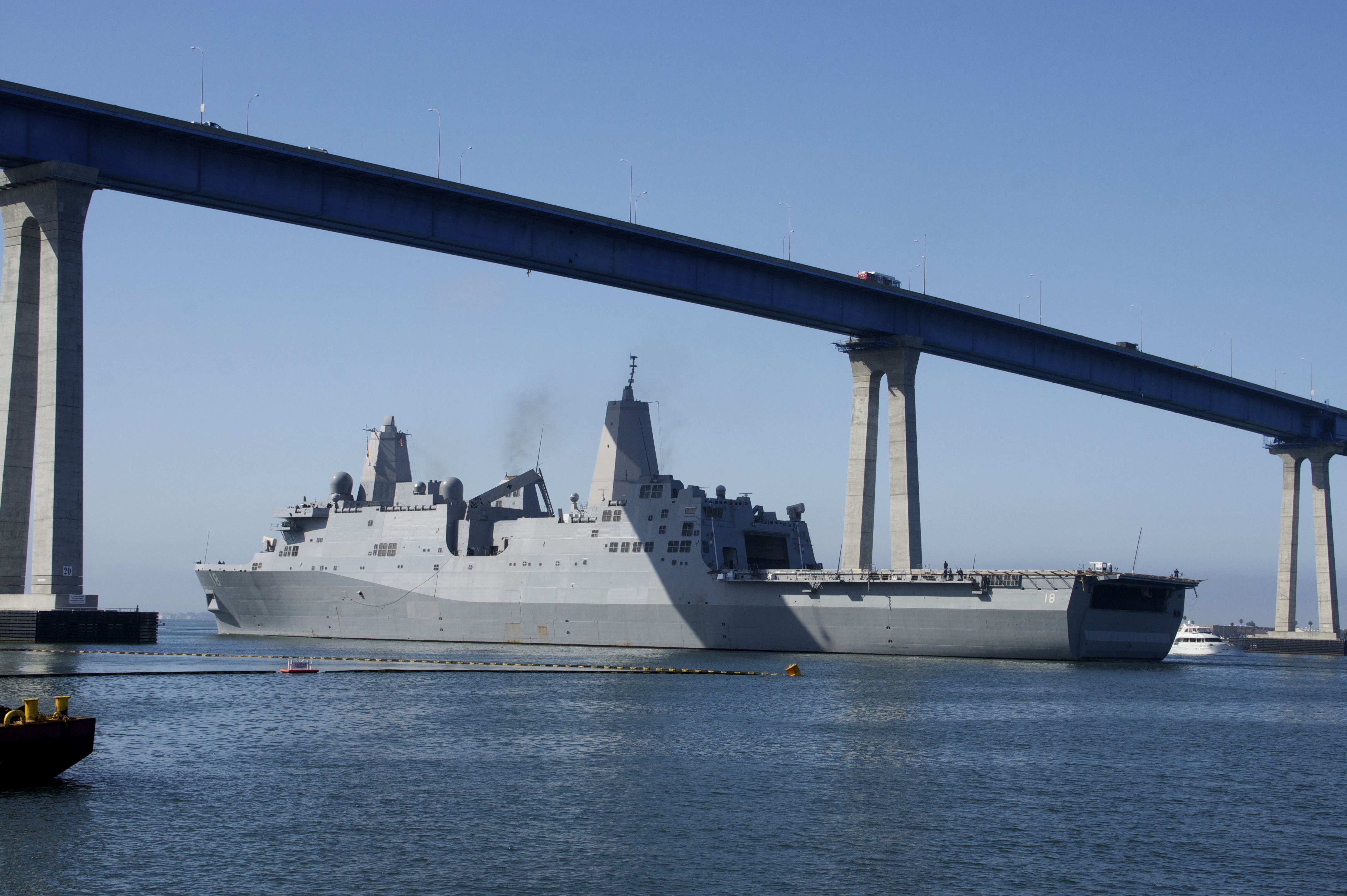 66k | USS New Orleans (LPD 18) transits through San Diego Bay prior to arriving in her new homeport of San Diego. The San Antonio-class amphibious transport dock, built and commissioned in her namesake city, is the first of the new class of ship to be homeported on the West Coast.