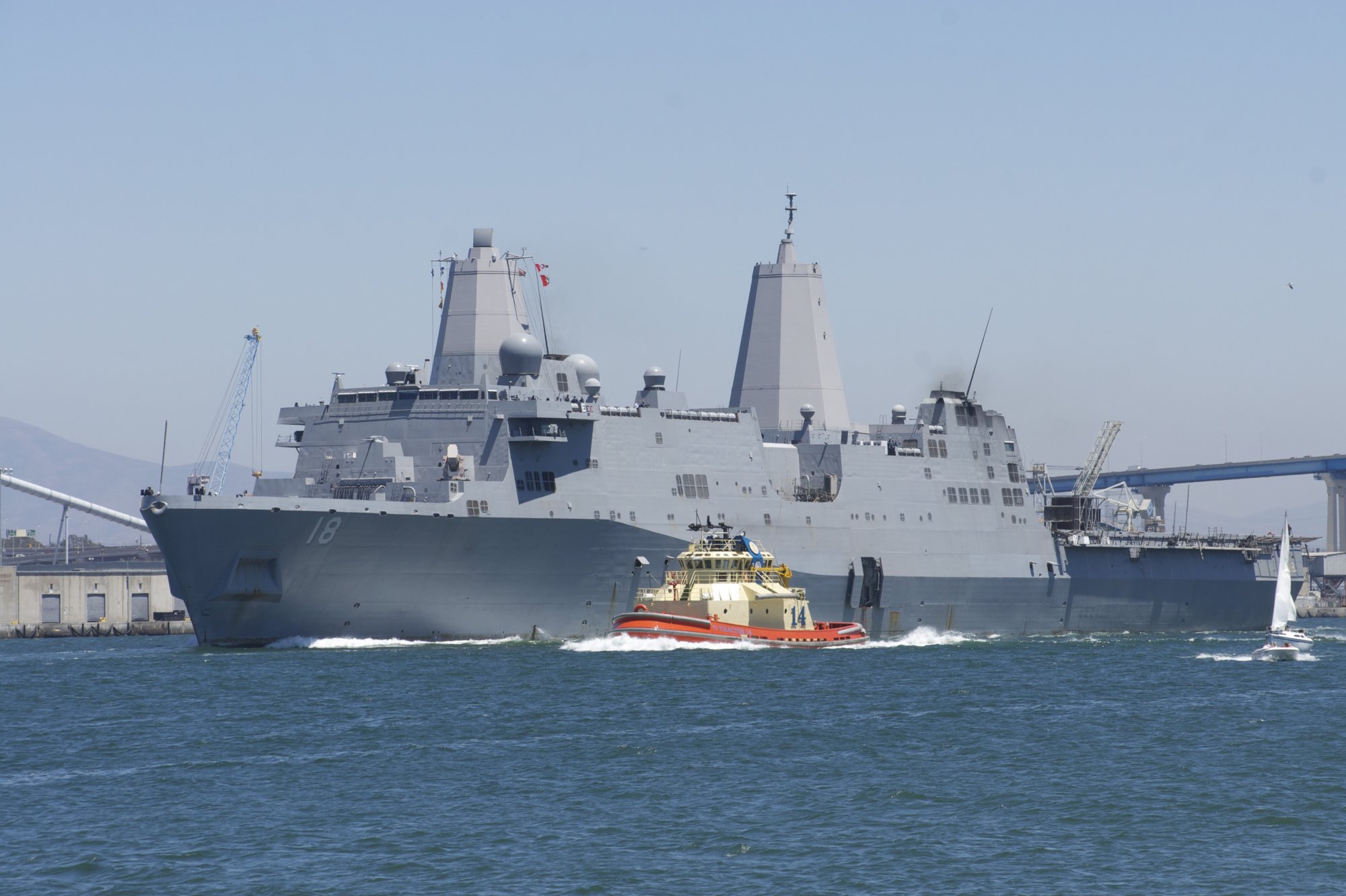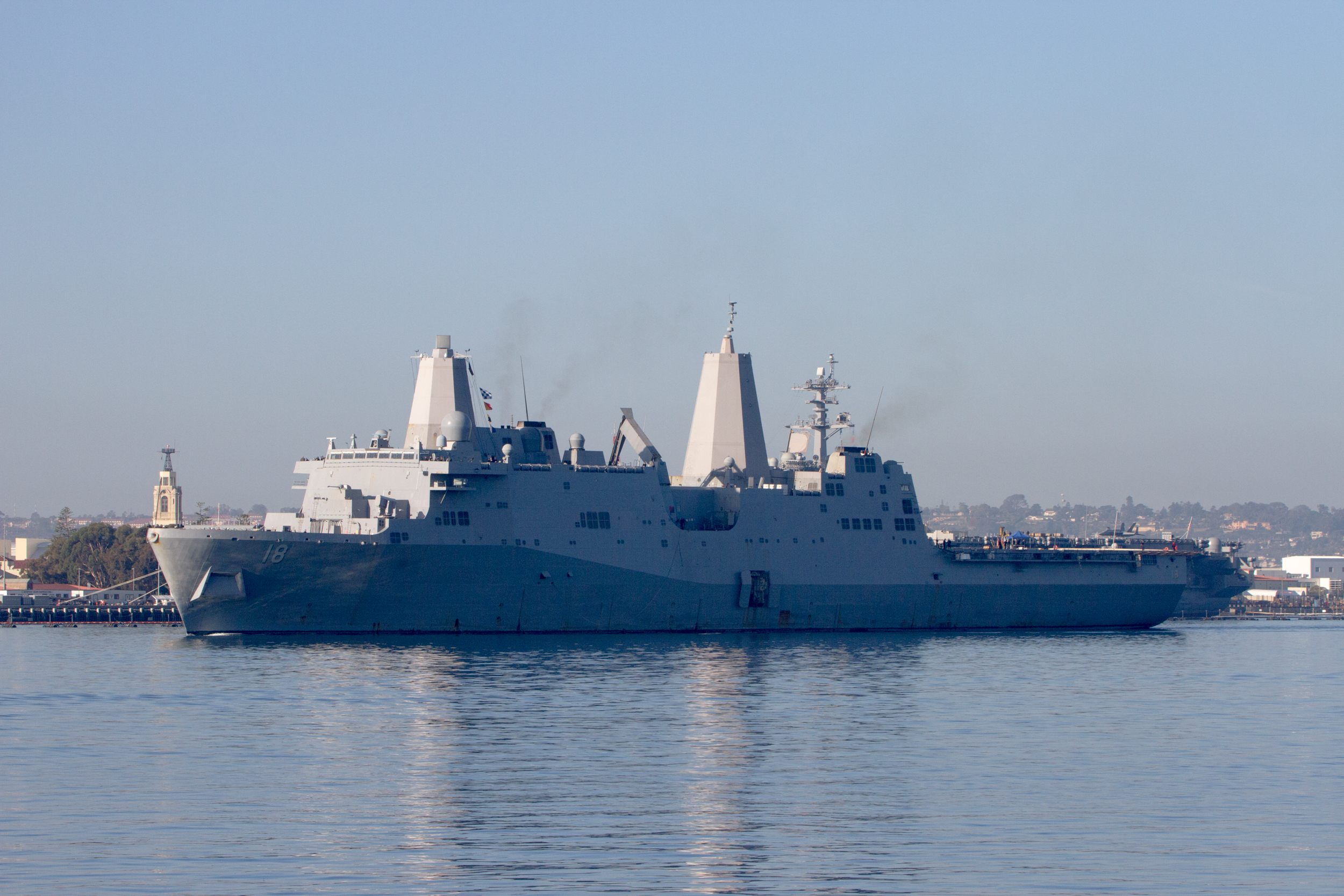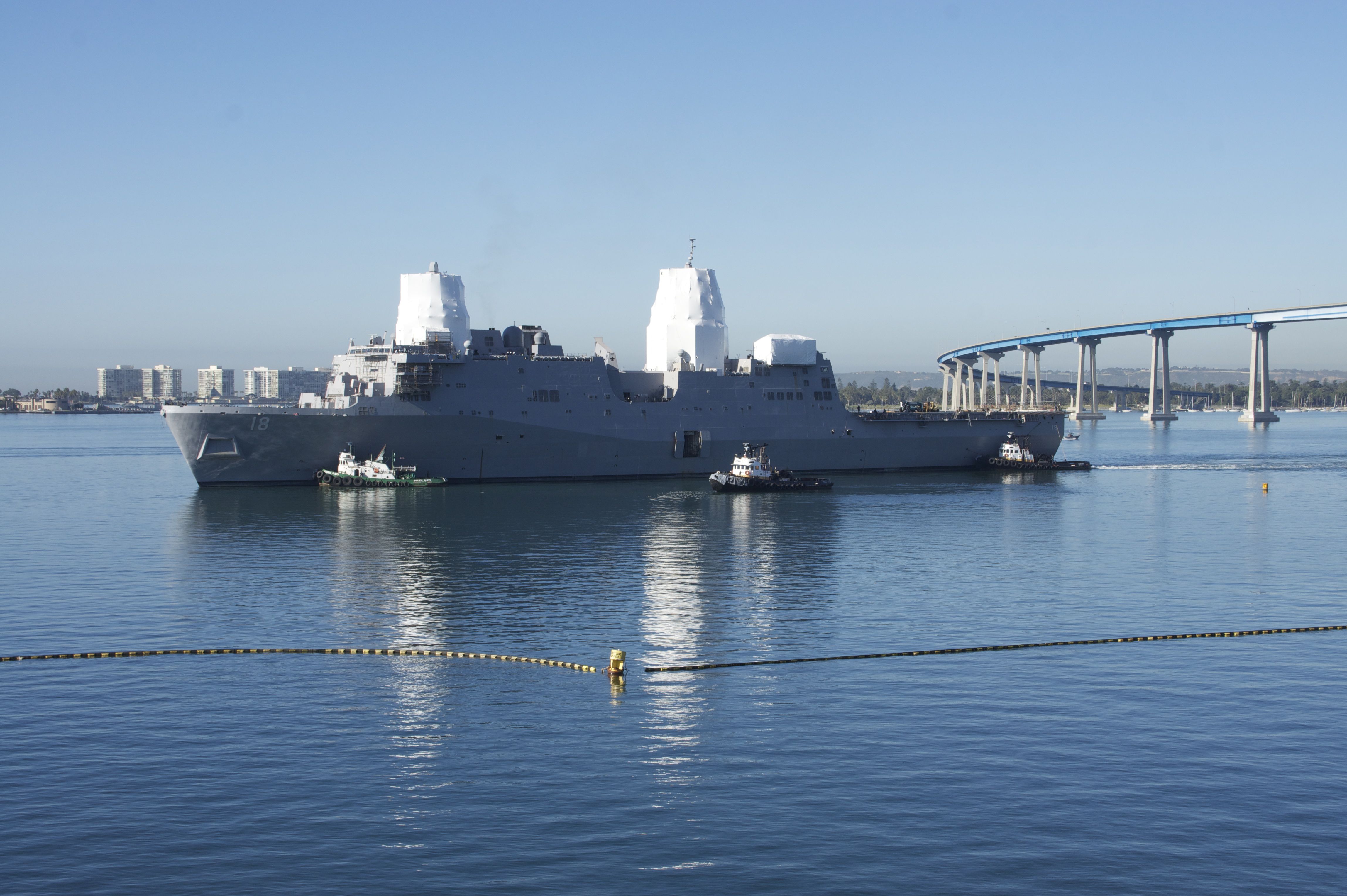 66k | USS New Orleans (LPD 18) transits through San Diego Bay prior to arriving in her new homeport of San Diego. The San Antonio-class amphibious transport dock, built and commissioned in her namesake city, is the first of the new class of ship to be homeported on the West Coast.