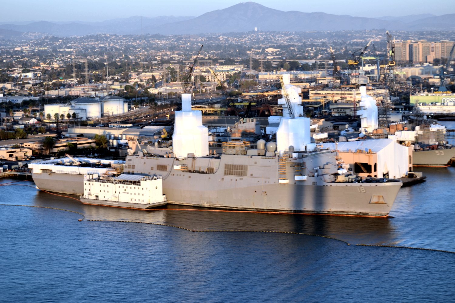 339k | USS New Orleans (LPD-18) moored pierside, September 2012, at Naval Station San Diego, with Repair Berthing and Messing Barge