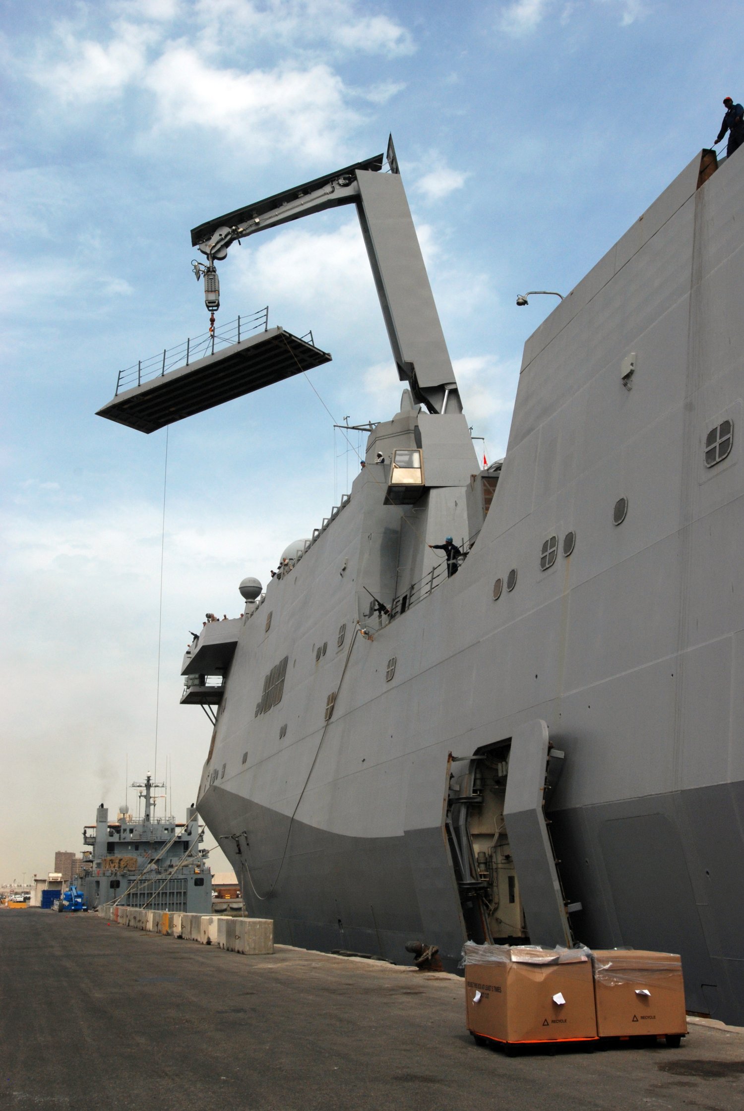 397k | USS New Orleans (LPD 18) lowers the ships' brow after mooring in Bahrain, 25 April 2009, where U.S. Navy engineers and