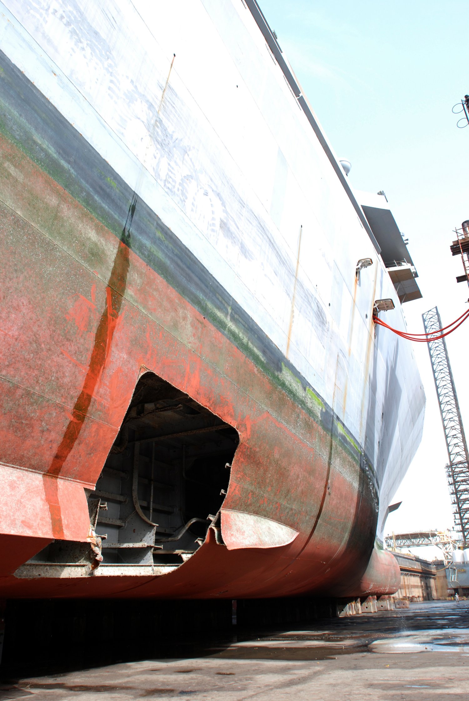 477k | An opening cut by divers, approximately 16 by 18 feet, before dry-docking USS New Orleans (LPD-18) is visible while
