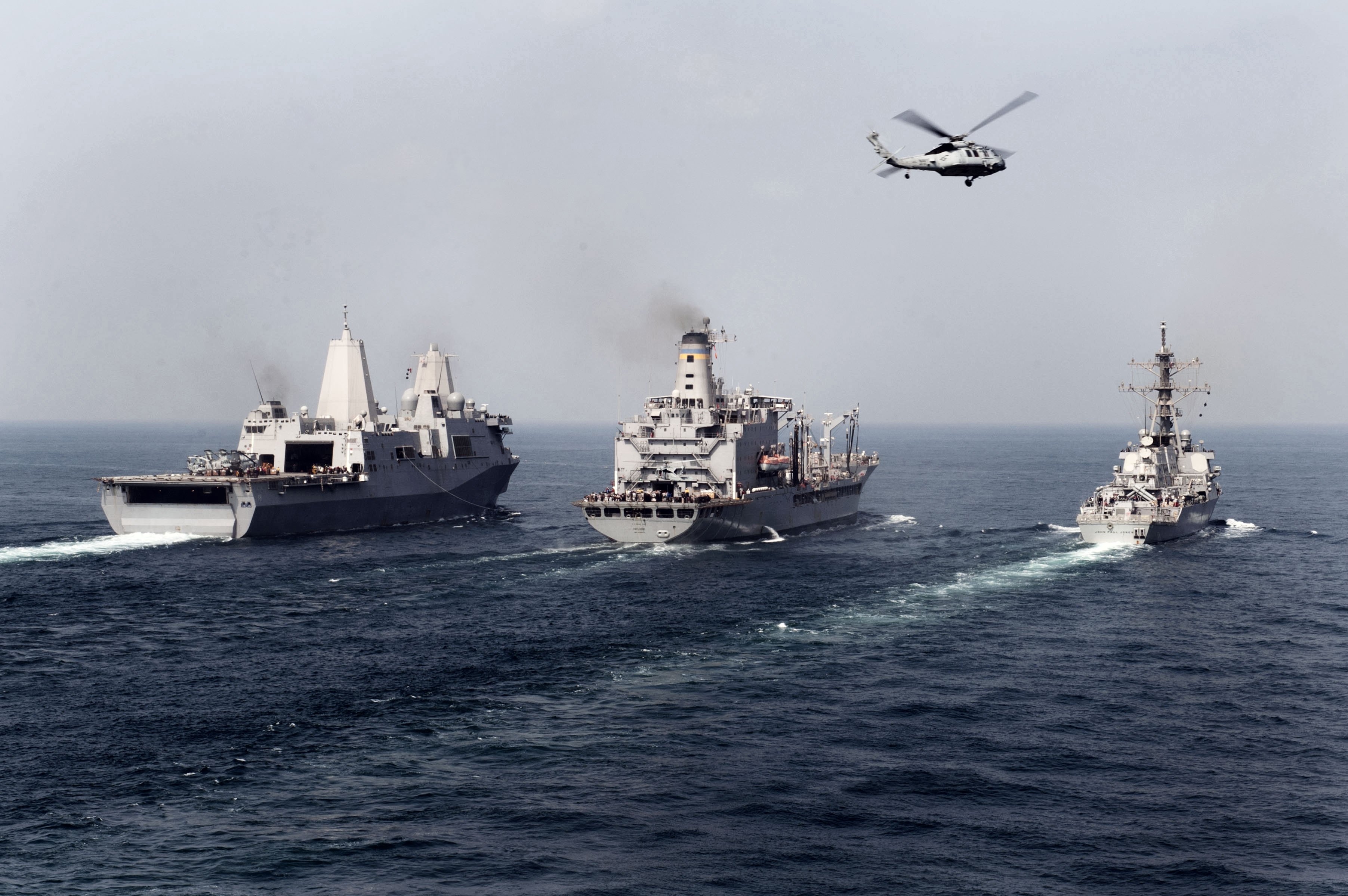 935k | USNS Patuxent (T-AO-201), center, conducts a simultaneous replenishment at sea with USS New Orleans (LPD-18), left, and the guided-missile destroyer USS John Paul Jones (DDG-53). New Orleans and John Paul Jones are operating in the U.S. 5th Fleet area of responsibility as part of the Makin Island Amphibious Ready Group. US Navy photo # 120214-N-KS651-188 ARABIAN GULF (Feb. 14, 2012) by MC2 Jason Behnke. |