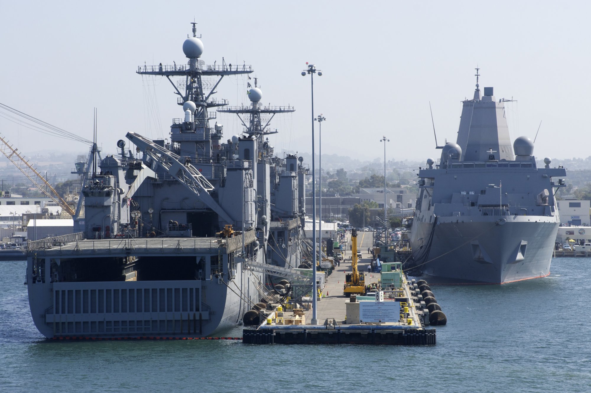 404k | The amphibious dock landing ships USS Pearl Harbor (LSD-52) and USS Rushmore (LSD-47) share a pier USS New Orleans (LPD-18) at Naval Base San Diego. US Navy photo # 110831-N-ZC343-617 SAN DIEGO (Aug. 31, 2011) by MCC Joe Kane. |