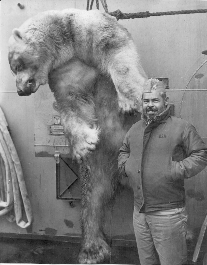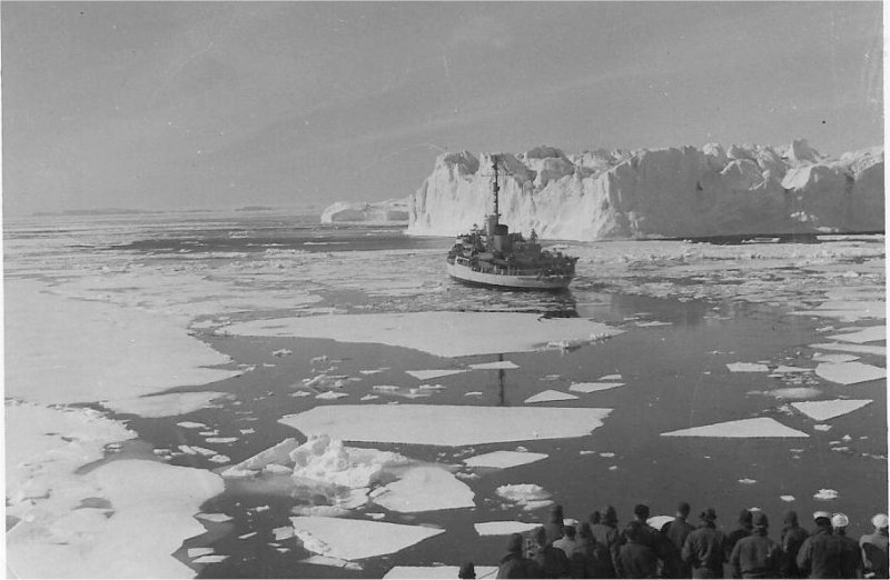 "It was during this time in the ice that our Captain, Commander Ramirez de Arellano shot a Polar Bear. Something that is not allowed now . I am attaching a picture of him and the polar bear and one of me with bear lying on the deck. I am also attaching a picture of the Lindenwald dwarfed along side of a large iceberg. I was a Boilertender and sometimes we could hear them scraping the side of the ship. I am attaching some miscellaneous pictures, which I know you can’t use some or any, but I do thank you for your consideration."