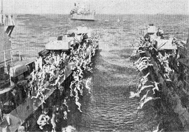 89k | USS Catamount (LSD-17)'s well deck makes a unique swimming hole for NROTC midshipmen being trained in techniques of amphibious warfare. US Navy photo from "All Hands" magazine, September 1949. |