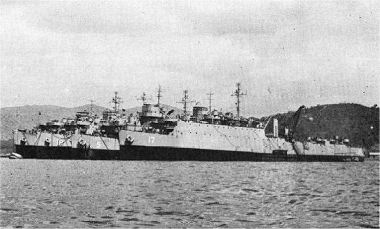 84k | From left to right; unknown LSD, USS USS Colonial (LSD-18), USS Gunston Hall (LSD-5) and USS Catamount (LSD-17) rendezvous at a Japanese port, date unknown. US Navy photo from "All Hands" magazine November 1954. |