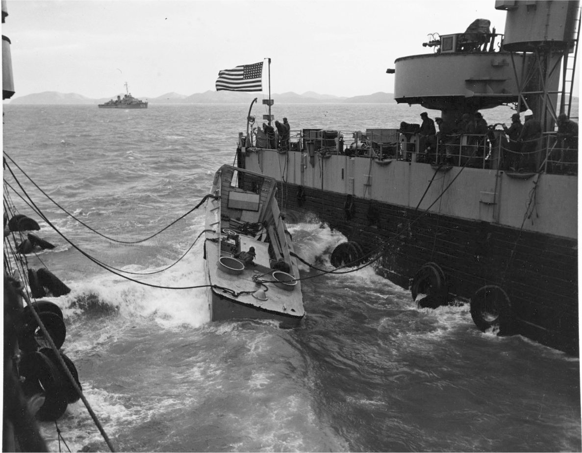 184k | A LCVP bucks in the well of USS Catamount (LSD-17), during mine clearance operations off Chinnampo, circa November 1950.