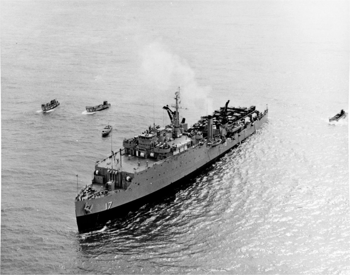 184k | USS Catamount (LSD-17) surrounded by small craft as she offloads amphibious forces and supplies in South Vietnam.