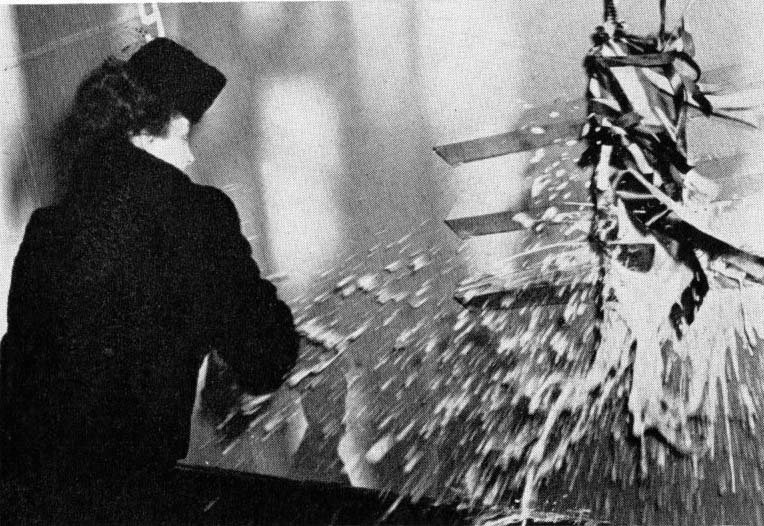 109k | Ship's sponsor Mrs. David Satterfield christening Catamount LSD-17, 22 December 1944, at Newport New Shipbuilding and