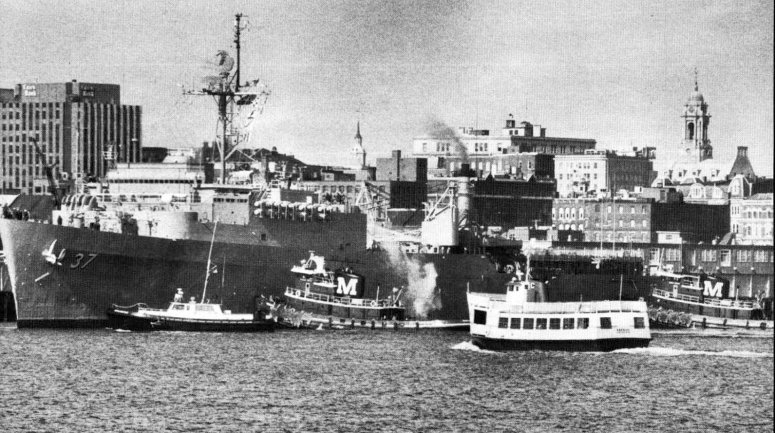 86k | USS Portland (LSD-37) departing Naval Amphibious Base, Little Creek, VA., for deployment to the Middle East to take part in Operation Desert Shield, 15 August 1990. The large harbor tug Campti (YTB 816) is alongside to provide assistance as needed.