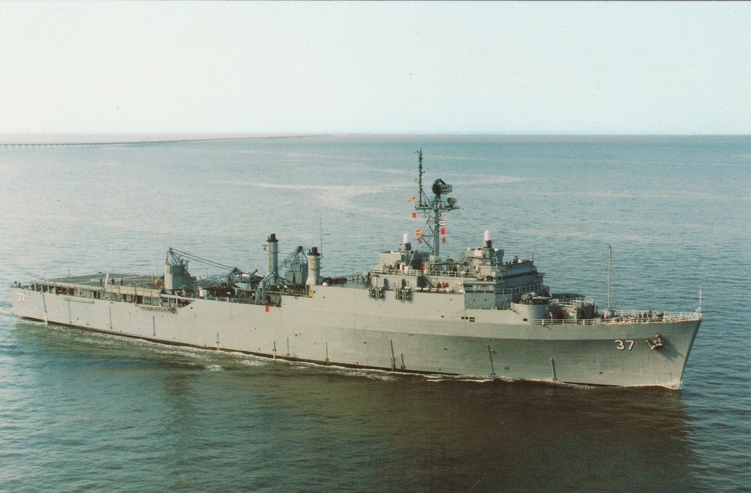 375k | USS Portland (LSD-37) underway outbound to sea from NAB Little Creek just past the Chesapeake Bay Bridge Tunnel, date unknown.