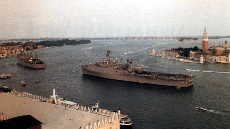 304k | USS Trenton (LPD-14), center, and USS Portland (LSD-37), left, at anchor in the lagoon at Venice, Italy, in 1986.