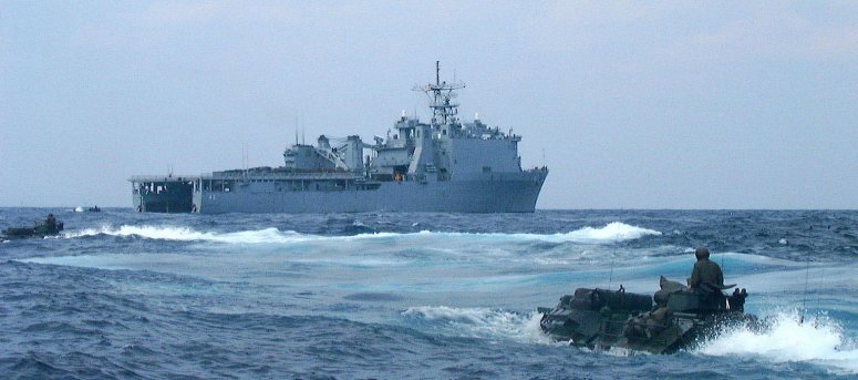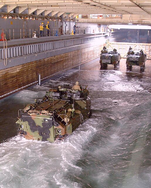 91k | Amphibious Assault Vehicle (AAVs) of the 31st Marine Expeditionary Unit (MEU) enter USS Fort McHenry (LSD 43)'s well deck. The AAVs, embarked in USS Juneau (LPD 10), were conducting well deck training for the Sailors and Marines of both ships, 9 March 2002. US Navy photo by Wes Eplen JO3 USN |