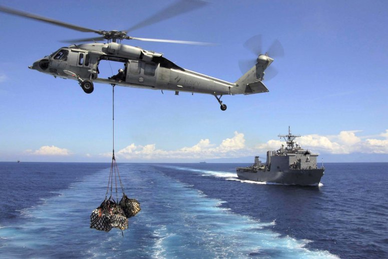 1205k | Sailors and Marines onload stores and relief supplies aboard USS Fort McHenry (LSD-43) as USS Carter Hall (LSD-50) passes by. Fort McHenry is participating in Operation Unified Response as part of USS Bataan (LHD5) Amphibious Relief Mission, providing military support capabilities to civil authorities to help stabilize and improve the situation in Haiti following a 7.0 magnitude earthquake on Jan. 12, 2010. US Navy photo # 100125-N-4971L-389 NEPLY, Haiti (Jan. 25, 2010) by MC1 Rachael L. Leslie. |