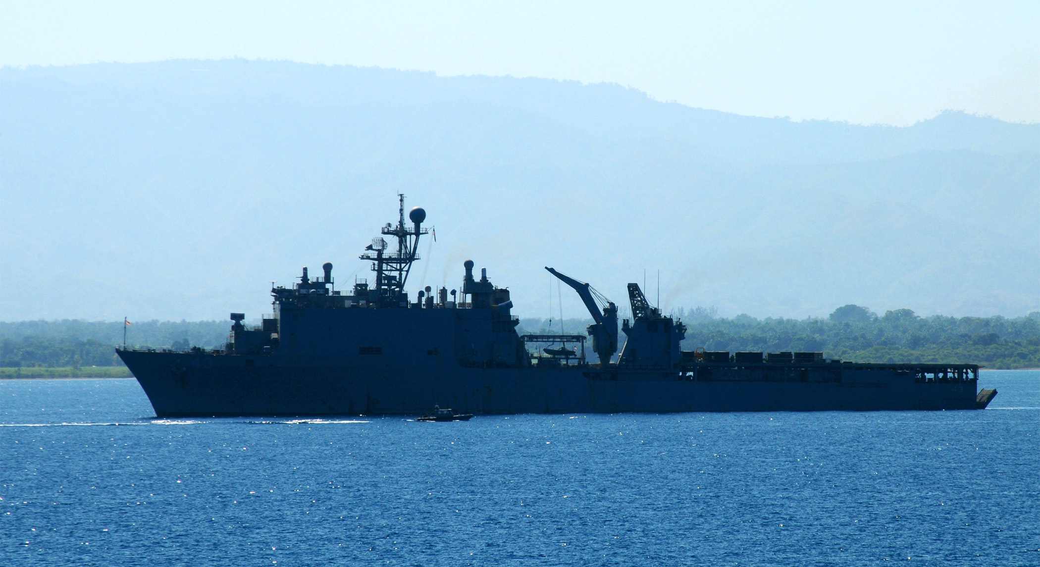 427k | USS Fort McHenry (LSD-43) at anchor off the coast of Neply. Fort McHenry is part of the Bataan Amphibious Relief Mission participating in Operation Unified Response, providing military support capabilities to civil authorities to help stabilize and improve the situation in Haiti following a 7.0 magnitude earthquake on Jan. 12, 2010. US Navy photo #s 100127-N-4971L-029 NEPLY, Haiti (Jan. 27, 2010) and 100127-N-4971L-033 NEPLY, Haiti (Jan. 27, 2010) by MC2 (SW) Rachael L. Leslie. |