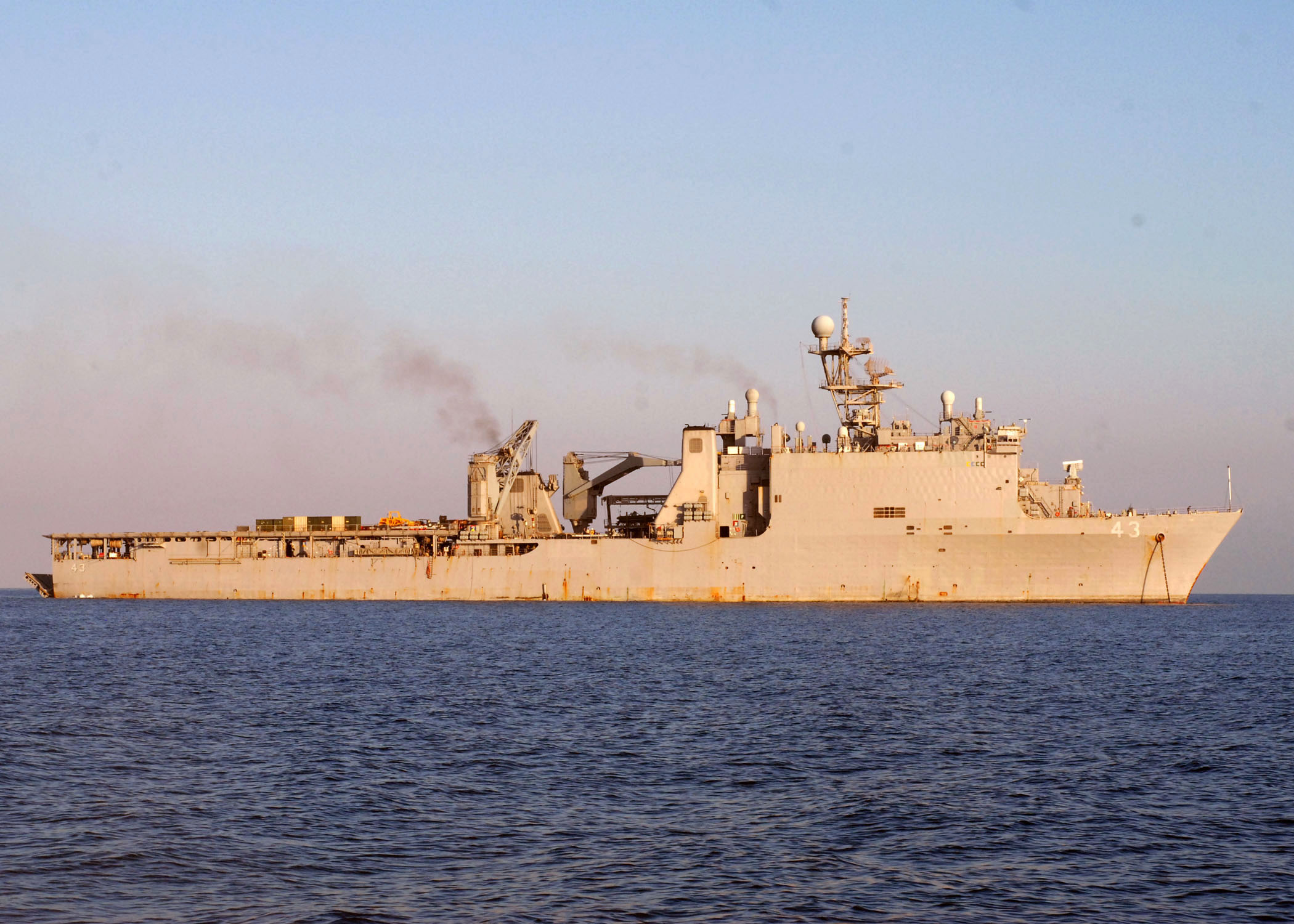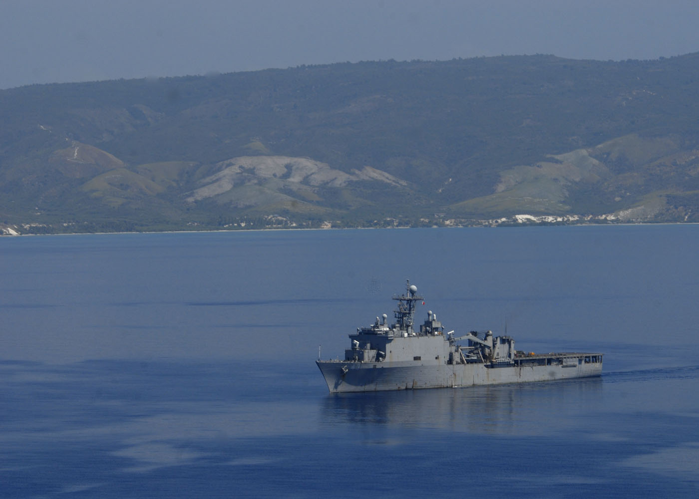 620k | USS Fort McHenry (LSD-43) operates off the coast of Port-au-Prince. Fort McHenry is supporting Operation Unified Response along with the amphibious dock landing ships USS Gunston Hall (LSD-44) and USS Carter Hall (LSD-50), and the multi-purpose amphibious assault ship USS Bataan (LHD-5). The ships are providing military support capabilities to civil authorities to help stabilize and improve the situation in Haiti in the wake of the 7.0 magnitude earthquake on Jan. 12, 2010. US Navy photo # 100121-N-7508R-035 BAIE DE GRAND GOAVE, Haiti (Jan. 21, 2010) by MC2 Julio Rivera. |