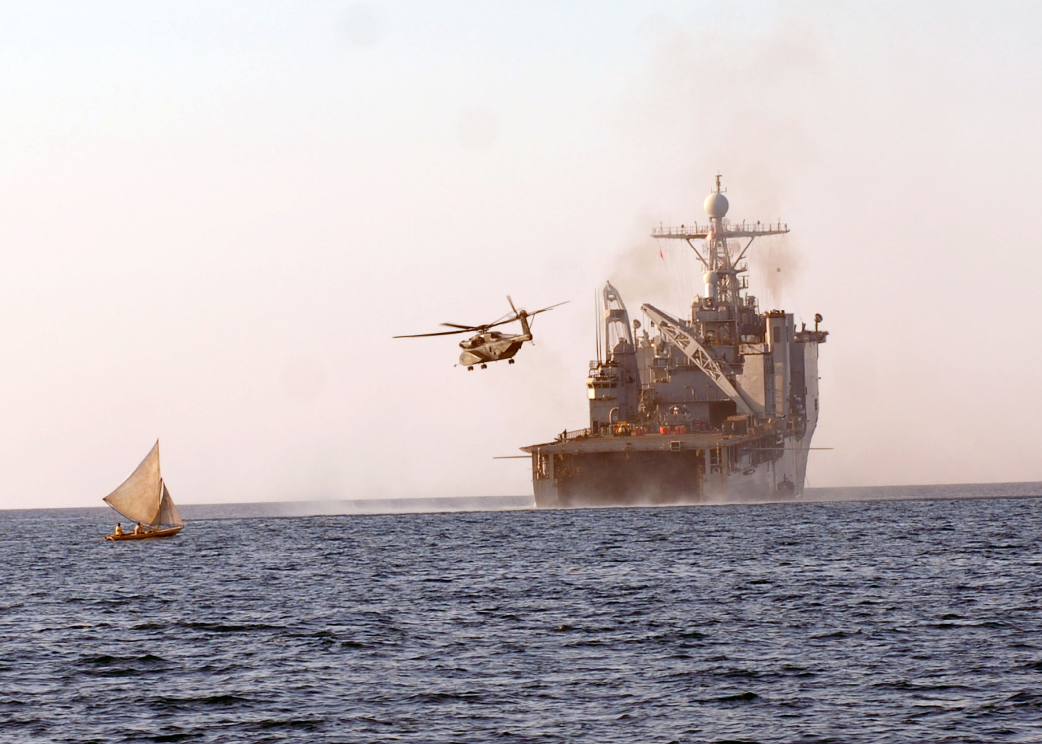 373k | A helicopter takes off from USS Fort McHenry (LSD-43) as a fishing boat sails past off the coast of Haiti. Fort McHenry is conducting humanitarian and disaster relief operations as part of Operation Unified Response after a 7.0 magnitude earthquake caused severe damage in and around Port-au-Prince, Haiti Jan. 12. US Navy photo # 100210-N-4971L-143 CARIBBEAN SEA, Haiti (Feb. 10, 2010) by MC1 (SW) Rachael L. Leslie. |