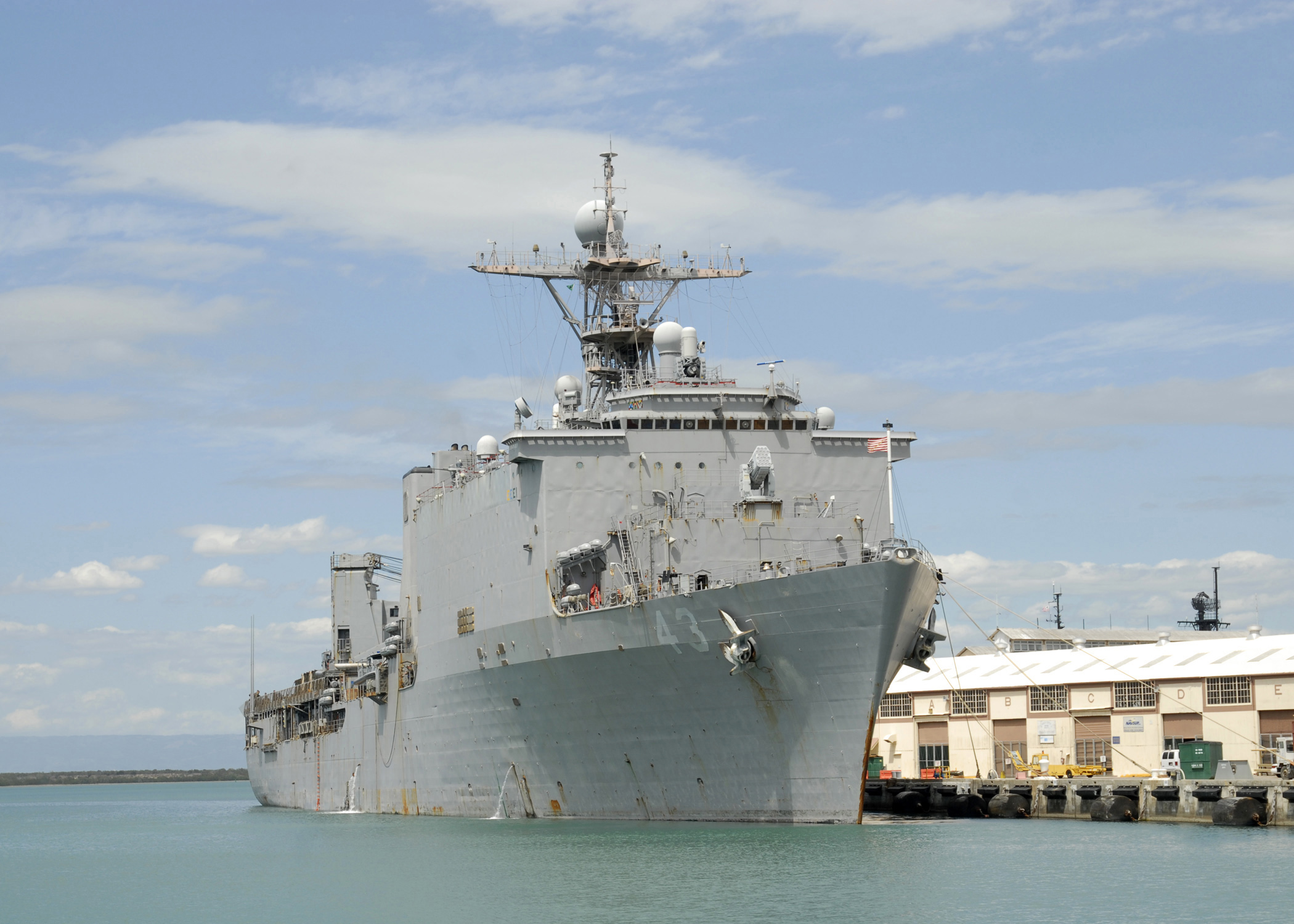 803k | USS Fort McHenry (LSD-43) moored pierside at Naval Base Guantanamo Bay, Cuba after completing wash down procedures in preparation to proceed to Morehead City, N.C. to offload Marines and equipment from the 22nd Marine Expeditionary Unit. Fort McHenry is returning from participation in Operation Unified Response. US Navy photo #100309-N-9301W-087 GUANTANAMO BAY, Cuba (March 9, 2010) by MC1 Darryl I. Wood. |