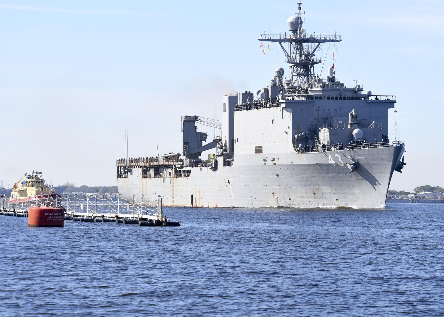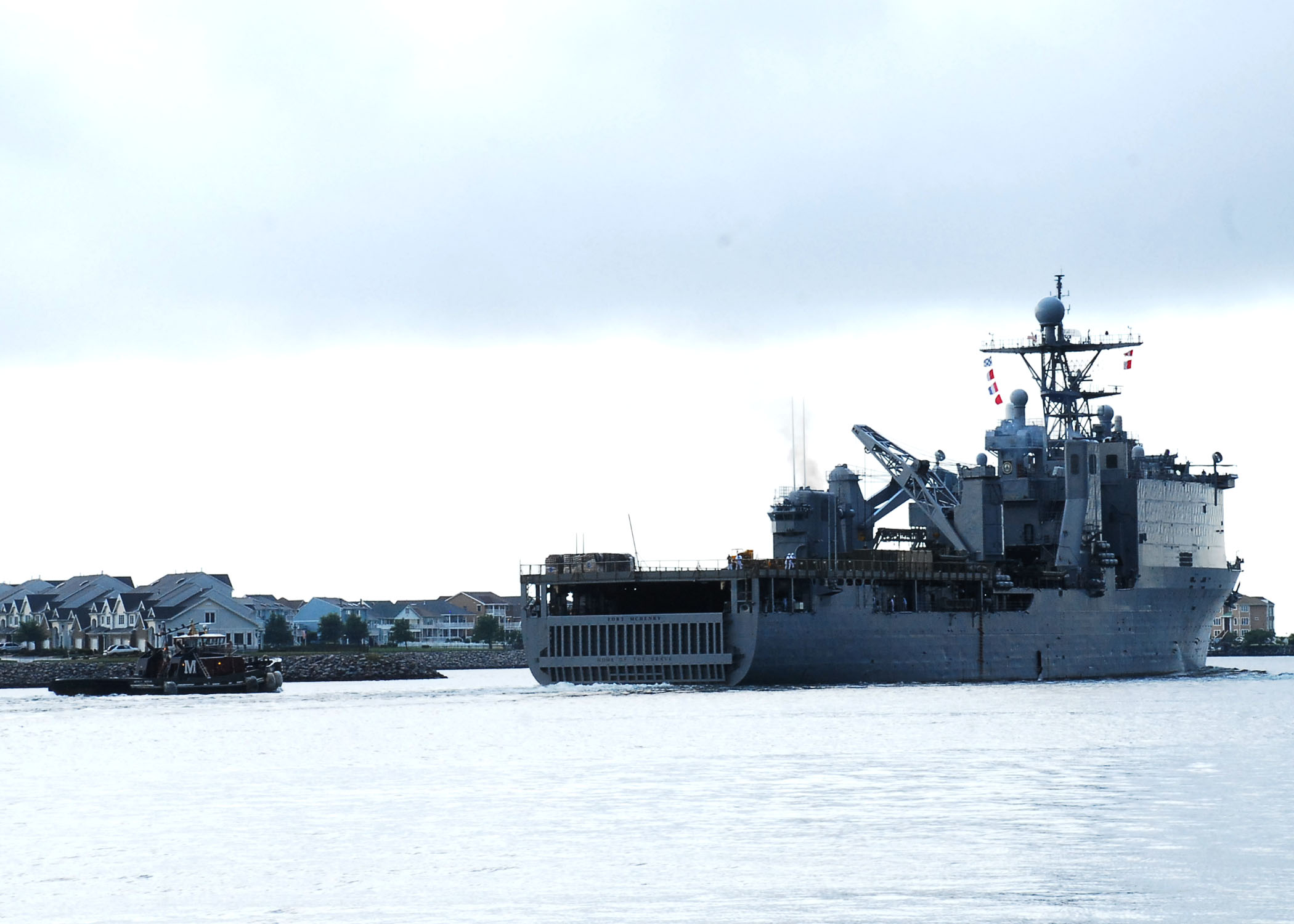 75k | The large harbor tug Canonchet (YTB-823) accompanies the red, white and blue garlanded USS Fort McHenry (LSD-43) through the harbor at San Diego, CA., 17 April 1991. Fort McHenry is returning from deployment in the Persian Gulf area during Operations Desert Shield/Desert Storm.
