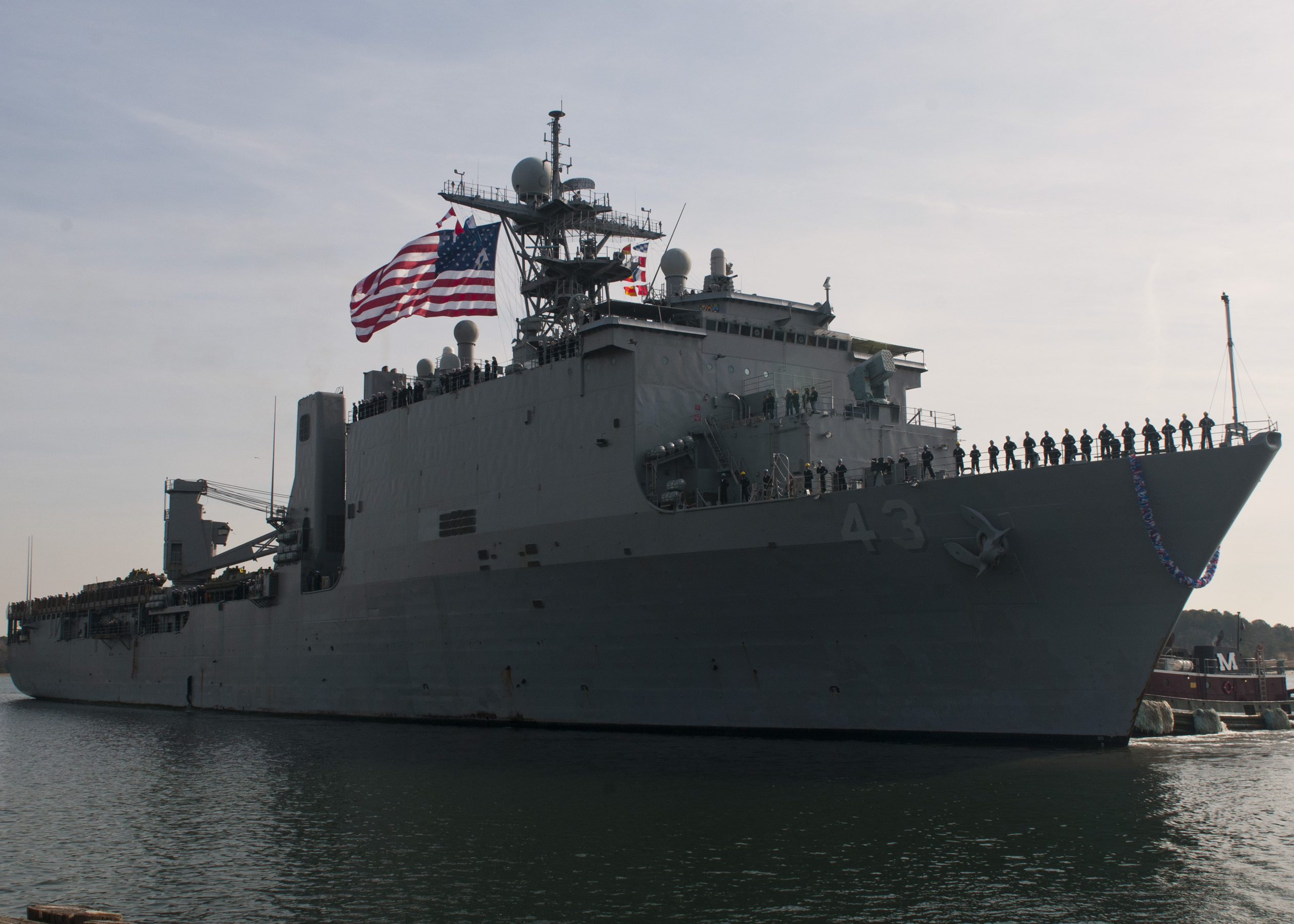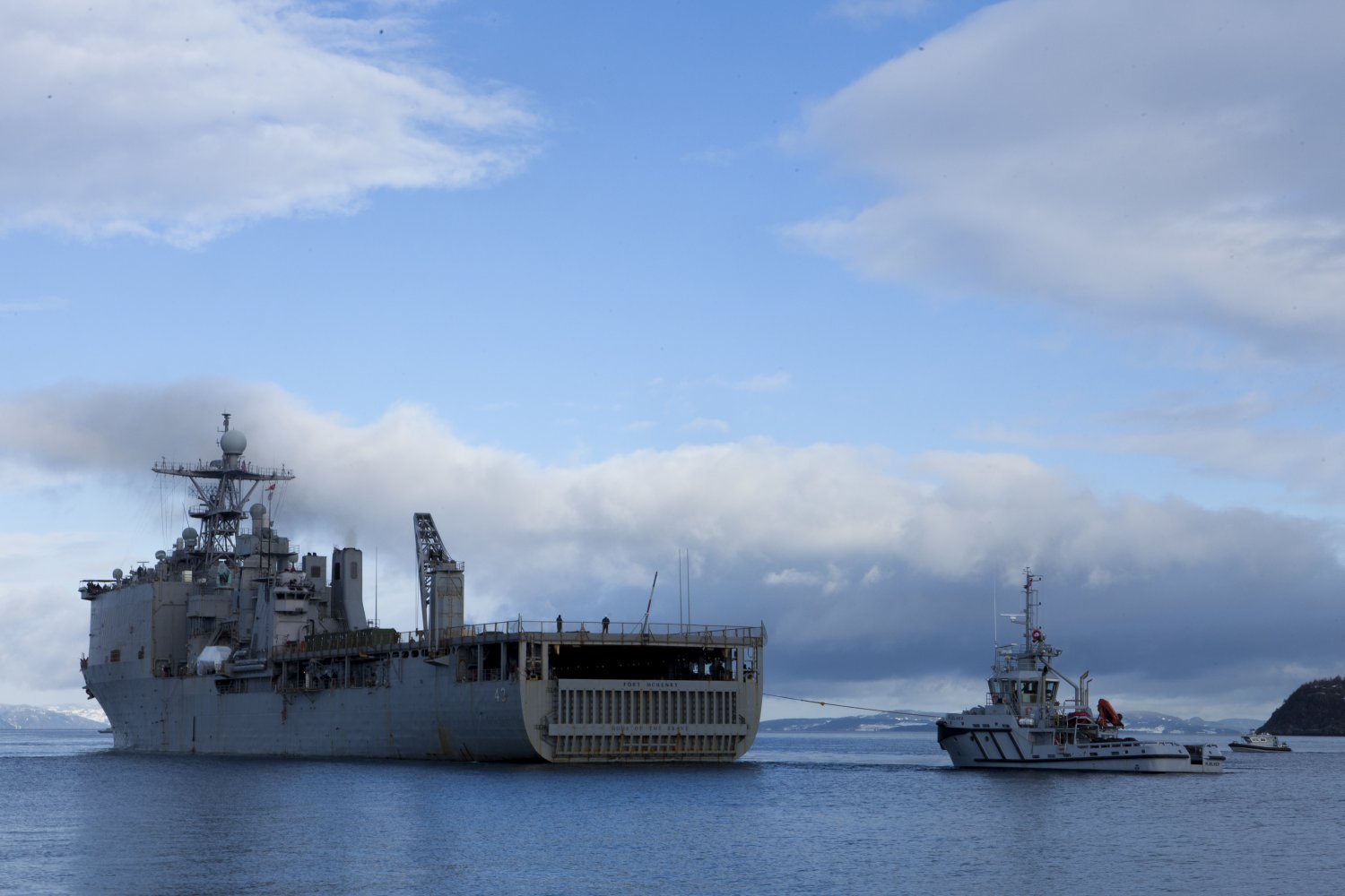139k | USS Fort McHenry (LSD-43) being towed to a pier as a part of Cold Response 16 (CR16), 28 February 2016, at Trondheim, Norway.