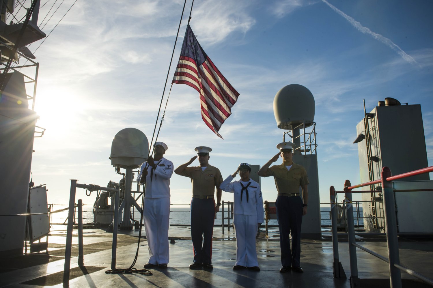 202k | Sailors and Marines aboard USS Fort McHenry (LSD-43) raise the 15-star flag in honor of the 200th anniversary of the Battle of Baltimore. Fort McHenry is underway conducting Amphibious Ready Group exercises with elements of the embarked 24th Marine Expeditionary Unit (MEU-24). US Navy photo # 140914-N-DQ840-026 ATLANTIC OCEAN (Sept. 14, 2014) by MCSN Adam Austin. |