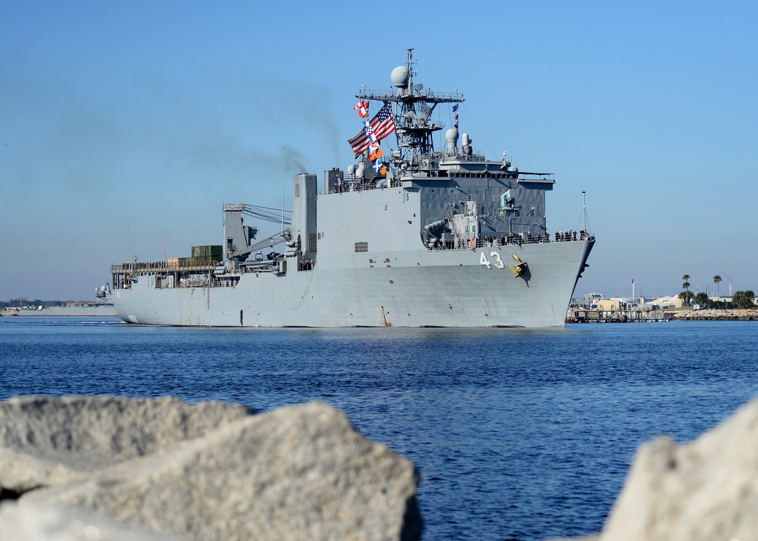 248k | USS Fort McHenry (LSD-43) departs Naval Station Mayport. The ship is deployed as part of the Iwo Jima Amphibious Ready Group with the 24th Marine Expeditionary Unit (MEU-24). in support of maritime security operations and theater security cooperation efforts in the U.S. 5th and 6th Fleet areas of responsibility. US Navy photo # 141213-N-BB308-033 MAYPORT, Fla. (Dec. 13, 2014) by MC1 John Parker. |