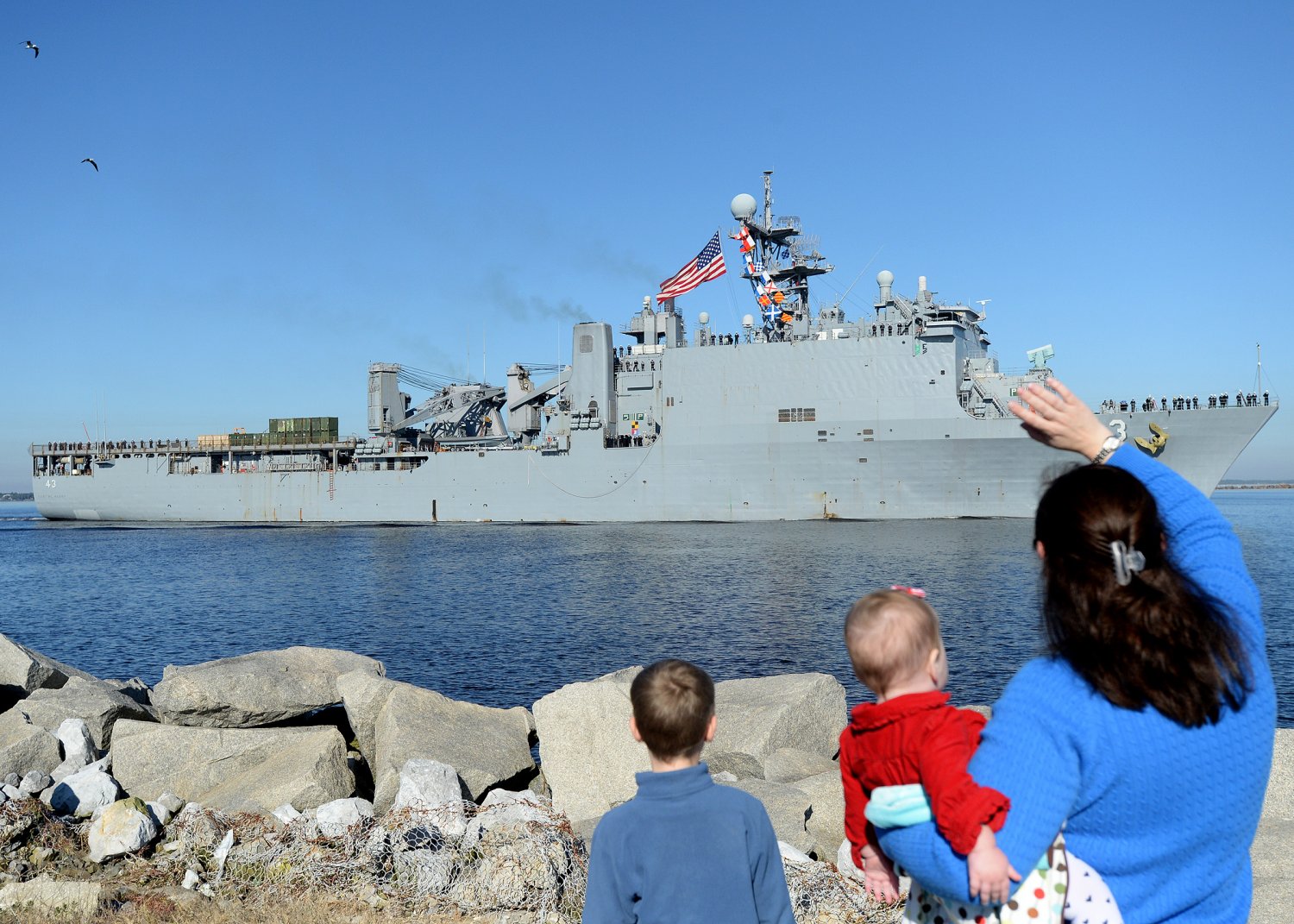 316k | Family members wave good-bye to Sailors aboard USS Fort McHenry (LSD-43). Fort McHenry deployed as part of the Iwo Jima Amphibious Ready Group to support maritime security operations and theater security cooperation efforts in the U.S. 5th and 6th Fleet areas of responsibility. US Navy photo # 141213-N-BB308-060 MAYPORT, Fla. (Dec. 13, 2014) by MC1 John Parker. |