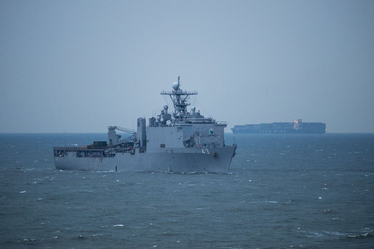 810k | USS Fort McHenry (LSD-43) anchored off the coast of North Carolina with the amphibious assault ship USS Bataan (LHD-5) in the distance beyond her bow while embarking personnel and equipment from the 22nd Marine Expeditionary Unit (22nd MEU). Fort McHenry is on a scheduled deployment with the Bataan Amphibious Readiness Group (ARG) supporting maritime security operations in the U.S. 5th and 6th Fleet areas of responsibility. US Navy photo # 090515-N-5345W-440 ATLANTIC OCEAN (May 15, 2009) by MC2 Kristopher Wilson. |